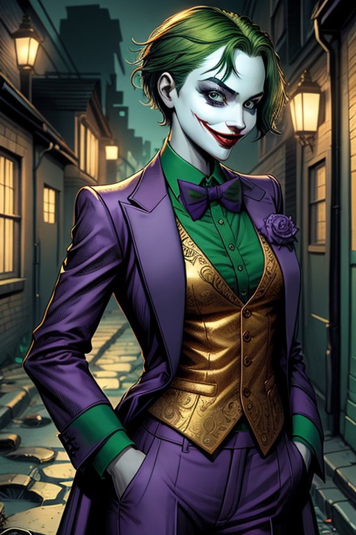 (full body shot:0.75), flash photography, long green hair, realistic photo of a female joker, jokerette, smiling, grimy alley background, woman in tailored purple jokersuit, looking at the camera, realistic, (masterpiece:1.1), (best quality:1.1), beautiful, (intricate details), unity 8k wallpaper, ultra detailed, aesthetic, perfect lighting, <lora:Joker(Arkhamverse):0.6>