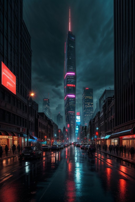 score_9, score_8_up, score_7_up, score_6_up, score_5_up, score_4_up, (absurdres, best quality, masterpiece:1.4), illustration, photorealistic, cinematic lighting, dynamic angle, perfect composition, futuristic city, neon lights, rainy night, skyscrapers, holographic billboards, street market, cybernetic implants, moody, high-tech