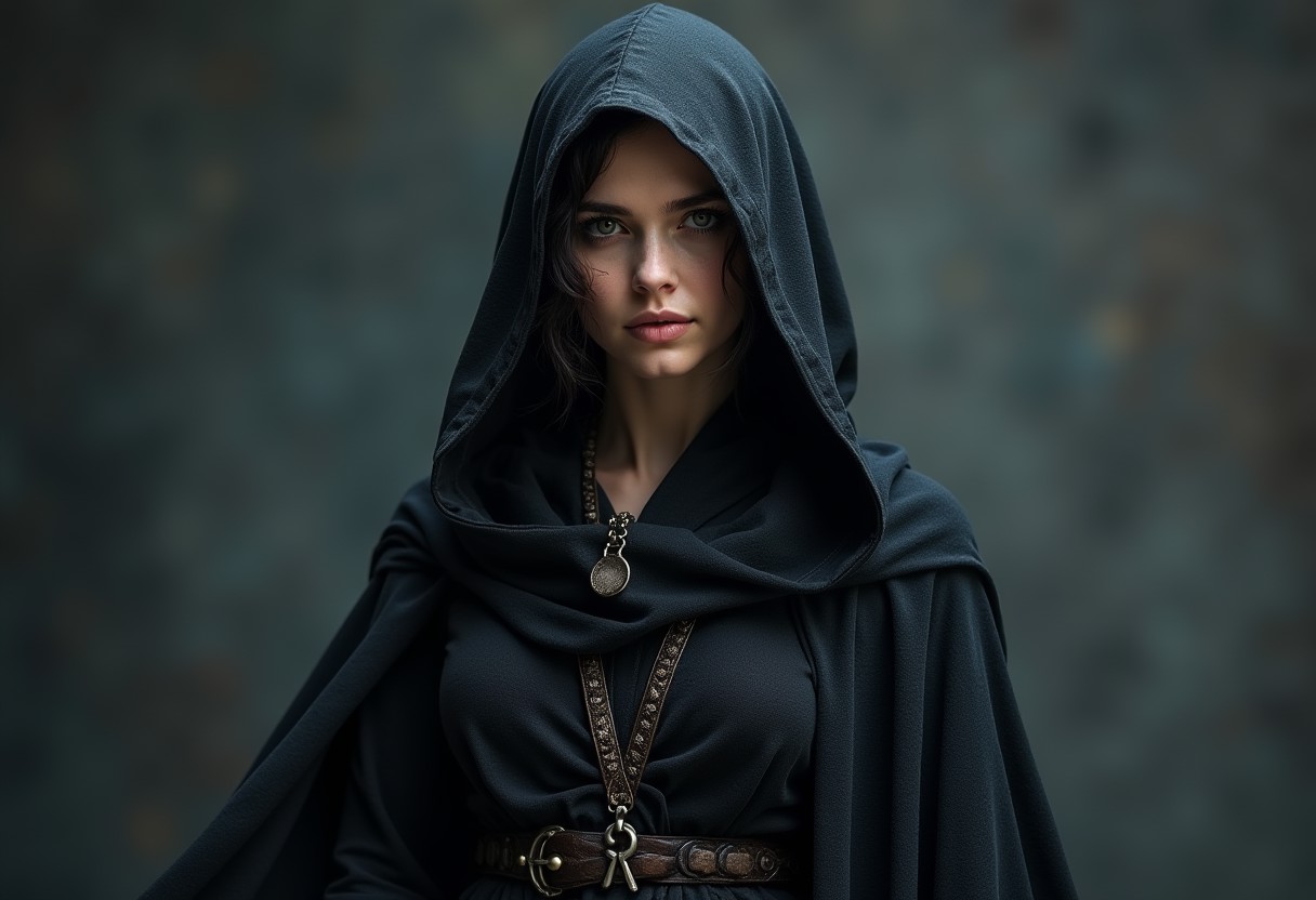 Ultra realistic image of a female fantasy wizard in dark robes.
