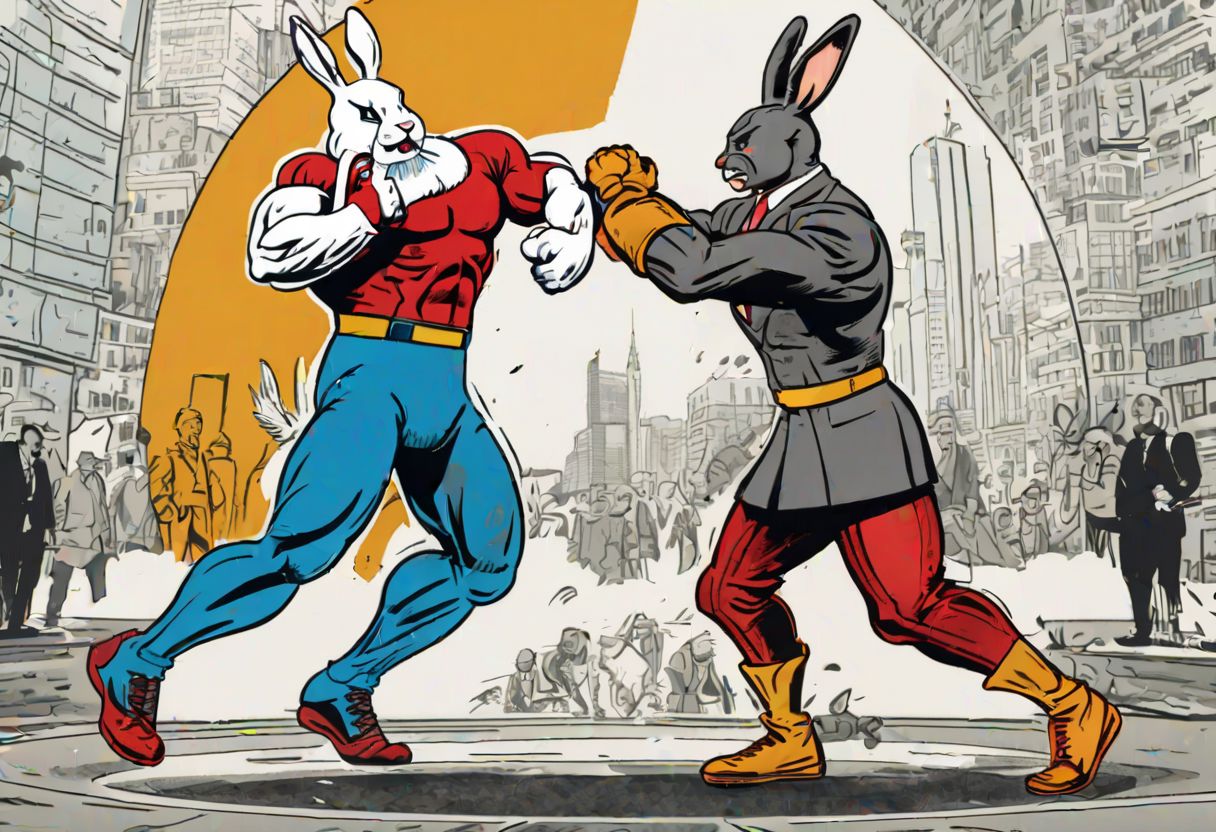 a Buff easter bunny wrestling a wrestler , Cartoon