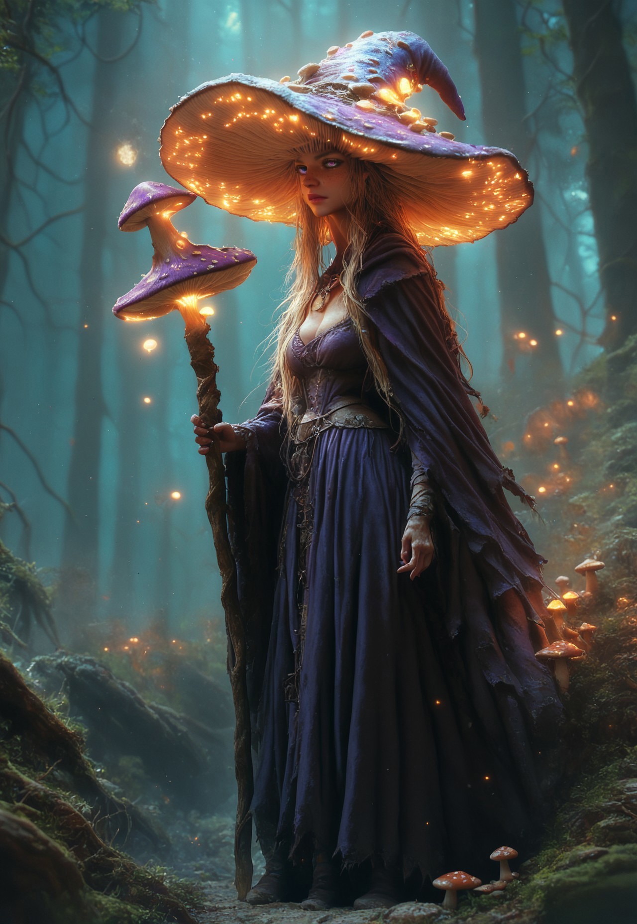 score_9, score_8, score_7, score_6_up, hknature, 1girl, solo, witch, mushroom hat, purple dress, glowing magical staff, foggy forest