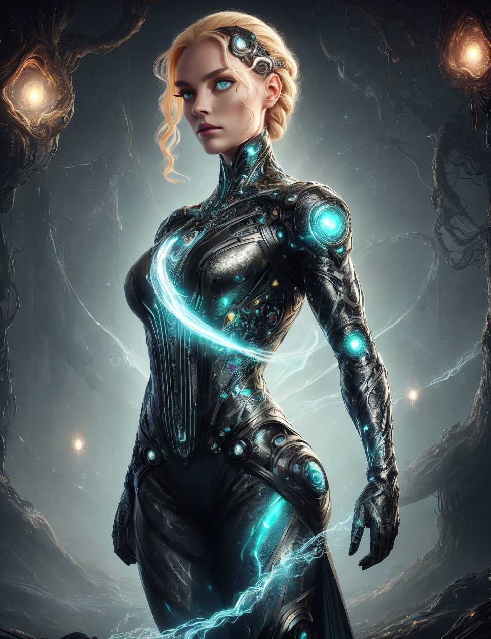 DonMV01dDw3113r5, masterpiece, detailed, quality,female explorer, twenty-something, firm, sub-saharan african, amber eyes, roman nose, unusual chin, strong jaw, straight forehead, delicate hands, high cheekbones, blonde dutch braid hair, puzzlement, cybernetic extension, character extends a cybernetic limb or appendage, showcasing its capabilities, wearing holographic culottes, digital mesh tapered pants, levitating headband ,,plasma-infused cloak , scribbling furiously in a spellbook, absorbing magical knowledge, cyber-noir <lora:DonMV01dDw3113r5-000008:0.65>