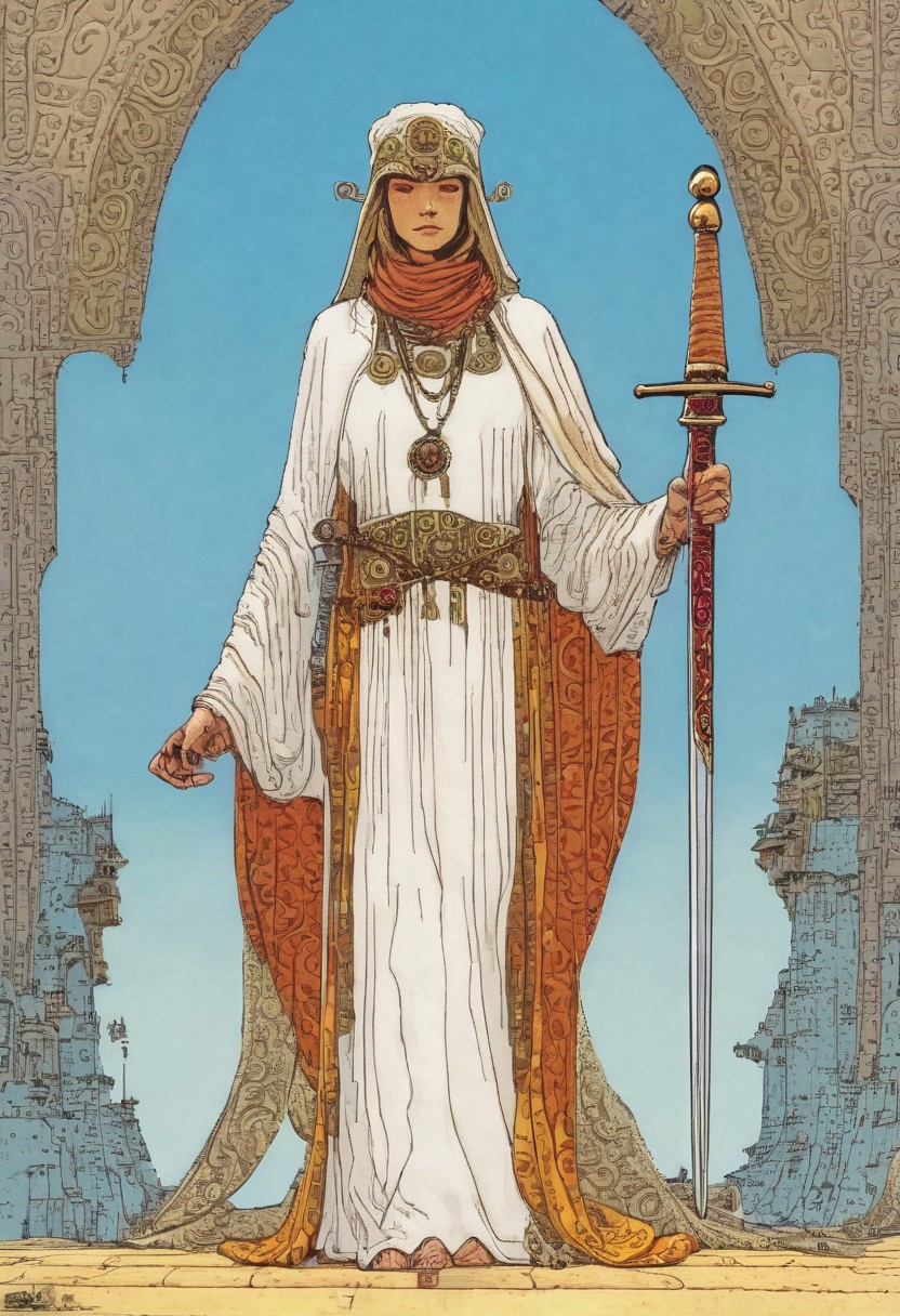 tarot card, BREAK, Moebius (Jean Giraud) Style page, BREAK, (female), blindfold, (((white robe))), scales, sword