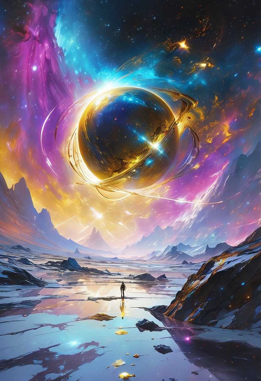 Close-up Futuristic alien, an unseen landscape of breathtaking outer space captured in 8K resolution for stunning detail, a massive, swirling nebula in bright shades of purple, blue and gold dominates the background, gaseous tendrils stretch through the star-studded void, reflecting the bright hues of a nebula, a distant planet with rings of shimmering ice and rock looms in the foreground, illuminated by the light of a nearby sun, casting a warm glow over the scene, tethered by a thin line, gazing in awe at the celestial beauty surrounding them, evoking a sense of wonder and exploration in this magnificent universe. beautiful gorgeous digital art,style of greg rutkowski,janek sedlar,jenny saville:0], novuschroma43 style