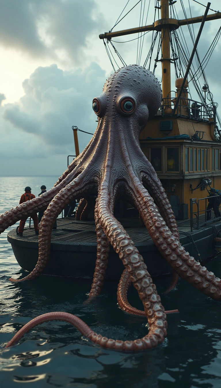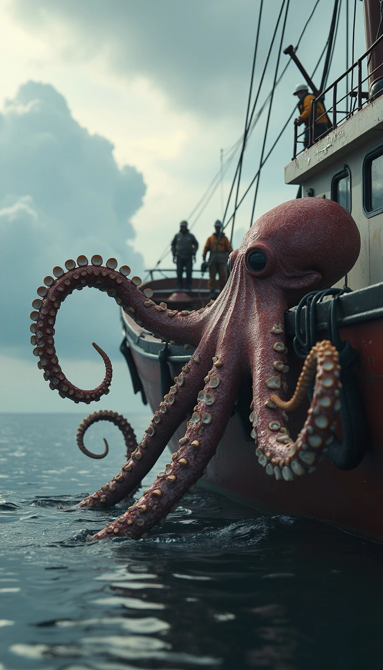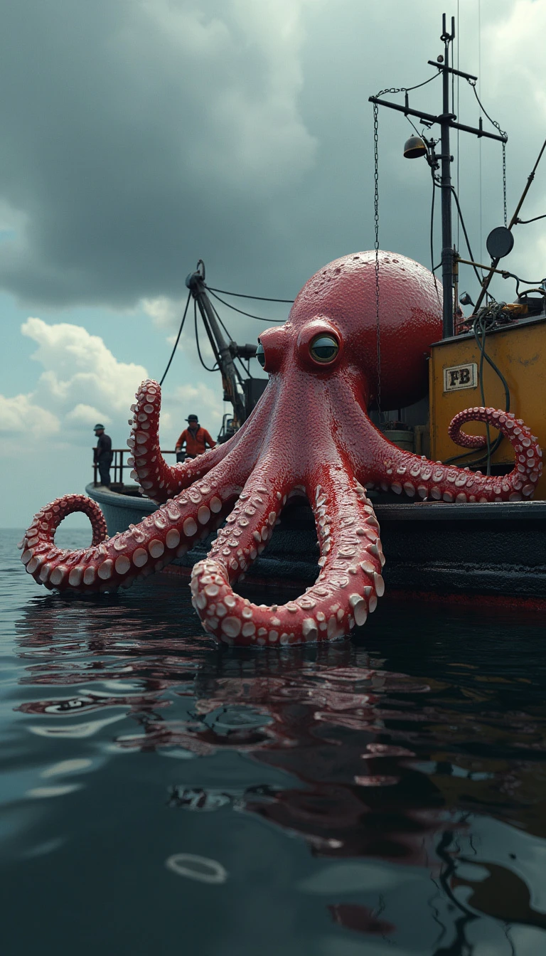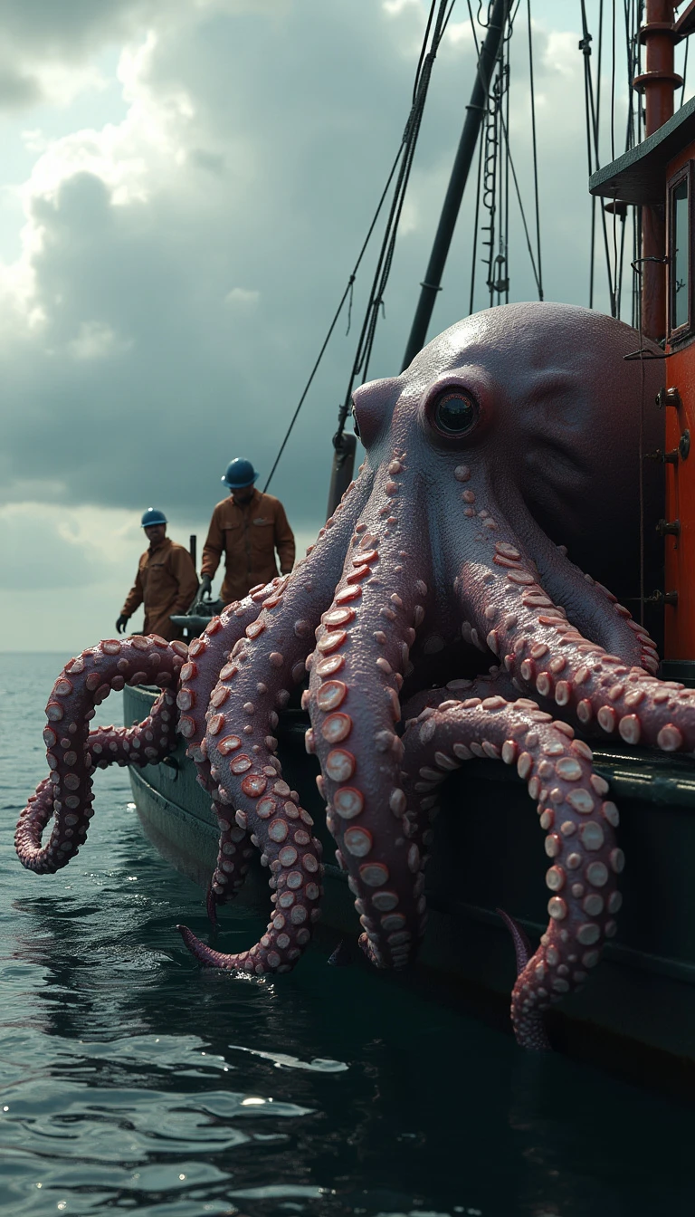 A hyper-realistic and lifelike 3D render of an industrial fishing boat scene with an enormous octopus, featuring large tentacles with suction cups, a speckled texture, set on a cloudy day with other crew members in the background, and big clouds in the sky, tailored to the user's preference for detailed and intricate designs with a dark and mysterious theme, in the style of real life photography with volumetric lighting.