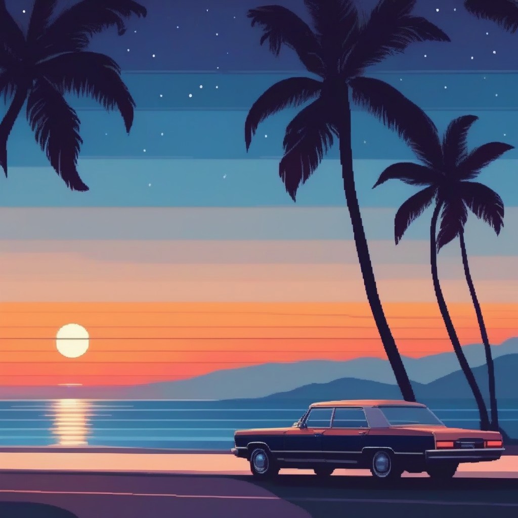masterpiece, best quality, very aesthetic, absurdres, pixel art, wide shot, ( no human:1.2), ( heavy traffic jam:1.2), side view, on a coastline, palm tree, retro wave color, twilight, starry sky,