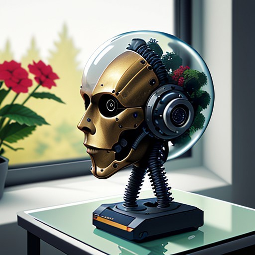 Hyper-realistic, 16k resolution, intricate details. (masterpiece, award winning artwork) many details, extreme detailed, full of details, Wide range of colors, high Dynamic OverallDetailXL <lora:add-detail-xl:0.95> <lora:WildcardX-XL-Detail-Enhancer:0.9> <lora:xl_more_art-full_v1:0.2>, robot,simple robot,robot with glass face,ellipse head robot,(made partially out of glass),computer chips,placed on a table,,begonia plant inside robot head,window in background , forest through window,