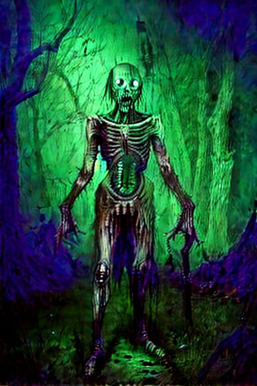 Photo of a undead warrior, rib cage, skeletal, helmet, armor, skinny, bones, decay, rotting flesh, glowing eyes. In a dark forest Hd, Masterpiece, 4k