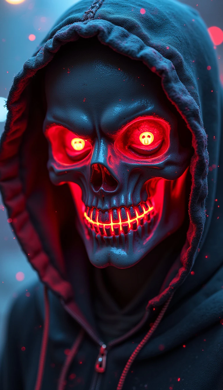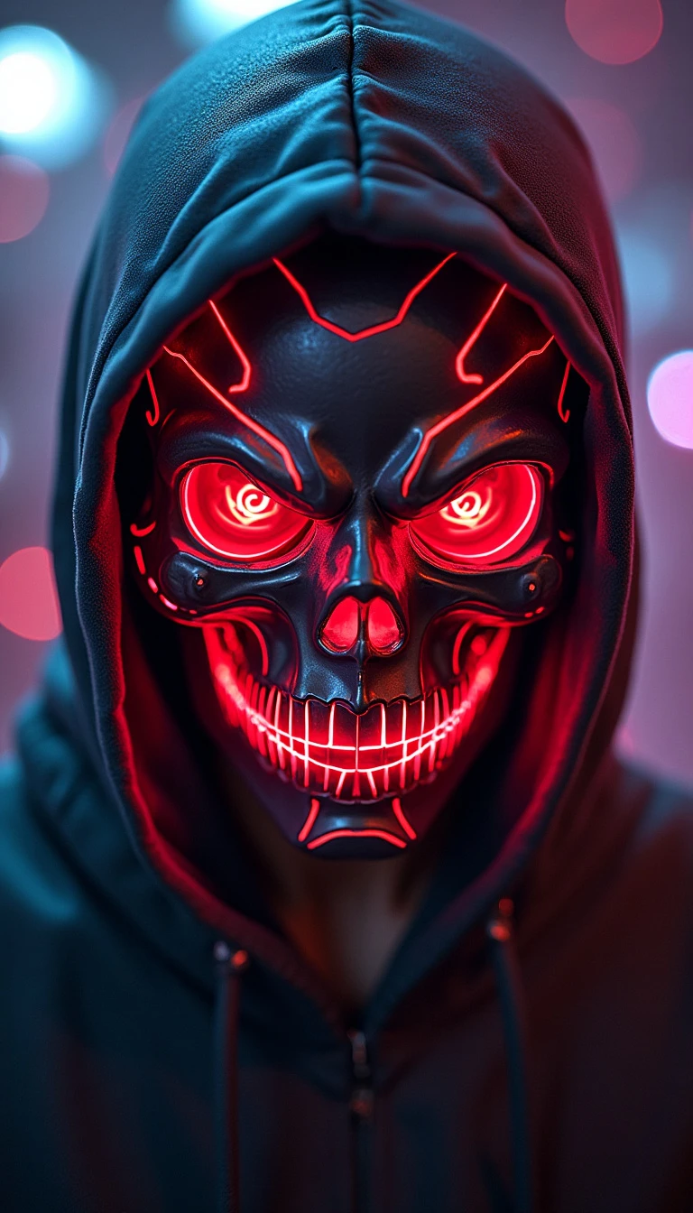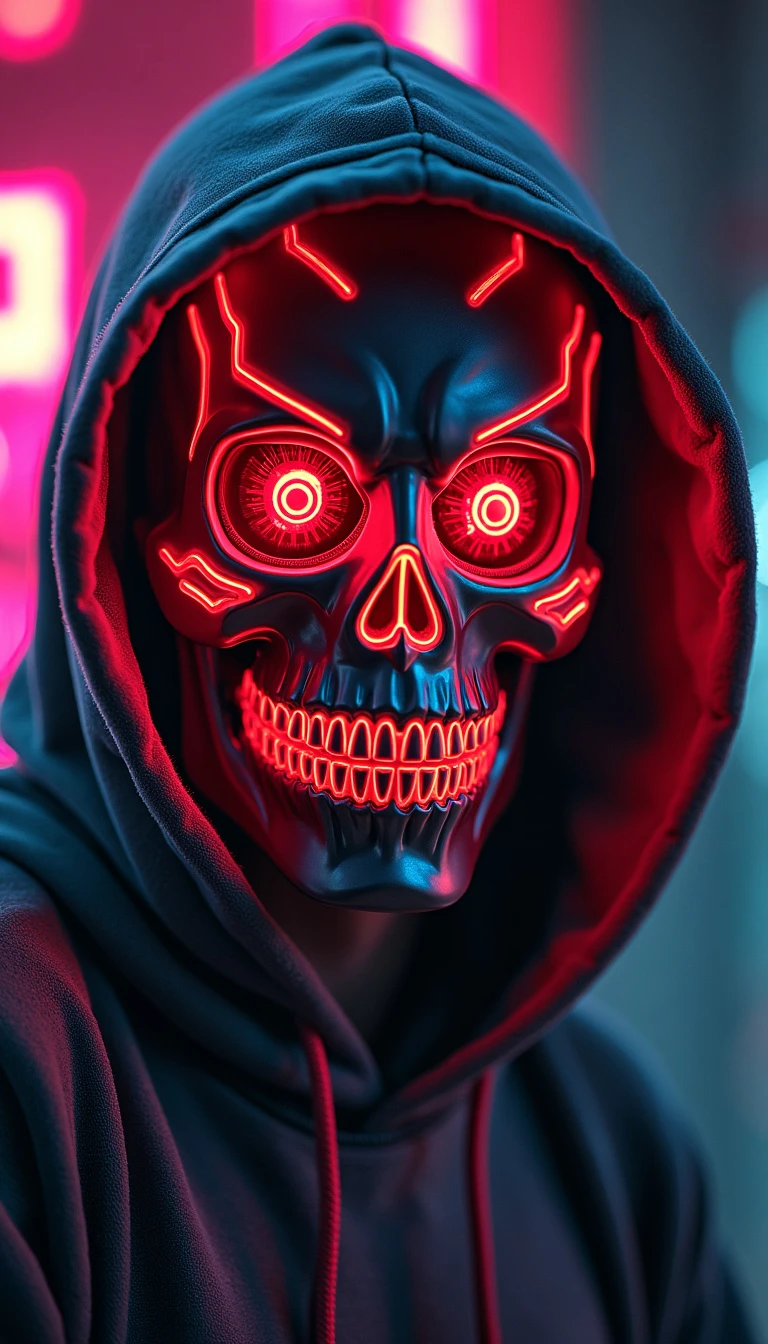 a close up of a person wearing a hoodie with a neon mask, cyberpunk horror style, neonpunk, glowing pink face, glowing red skull, evil smile and glowing eyes, red demon cyberpunk symbols, cyberpunk art style, cyberpunk face, cyberpunk artstyle, bright cyberpunk glow, dark synthwave, dark but detailed digital art, metal and glowing eyes, dark cyberpunk illustration