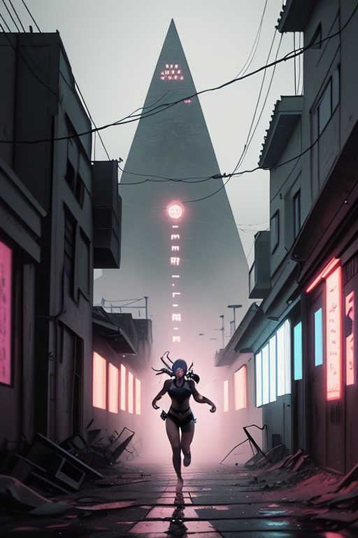 <lora:heroes:1> landscape, cyberpunk city, 2 girl playing tag, running toward the viewer, environment focus, concrete walls, brutalism, abandoned, rain, red haze, ominous aura, fog, alley, BREAK <lora:Ghost in the Shell Style:0.75> ghoinshsty, <lora:Pyramid lora_Ghibli_n3_0.7+Pyramid lora_Ghibli_v2_0.3:0.7> beautiful Ghibli scene, <lora:acid 3:0.5> acid poster, poster,