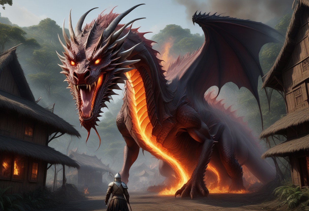 ultra realistic and quality image with high resolution and sharp focus photorealistic style, with ultra photo detail, of a sinister fire dragon burning a small village in the jungle, the village is made of wooden houses, ratio 1:1.5, ((a horseman in armor facing towards the dragon, he tries to pierce it with his spear))