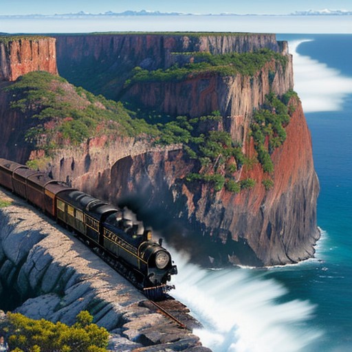 Retro looking black steam engine train travelling along rocky coastline by beautiful ocean, up high, rocks