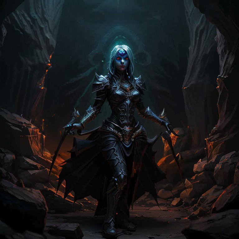 a full angle shot of a world of Warcraft style female sorceress, dancing at a ceremony with blades, super detailed eyes, their otherworldly markings, casting a dramatic, dark atmosphere over the entire scene, dark theme, epic, masterpiece