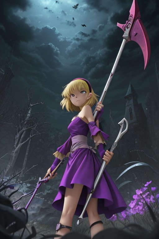 score_9, score_8_up, score_7_up, source_anime, BREAK, solo, 1girl, <lora:BloodyMen:1> bloodymen, bleedman, colored skin, violet skin,<lora:Mandy_PonyXL:1> mandygrim, 1girl, blonde hair, hairband, shaped hair, short hair, pointy hair, mandygrim hair, hair curling upwards, , hair over one eye, light purple dress, rag shoulder covering, detached oversized rag sleeves, skinny, young, small breasts, small waist, petite, wide hips, bis ass, patchwork skin, stitches, stitched face, white cuffed gloves, holding scythe,