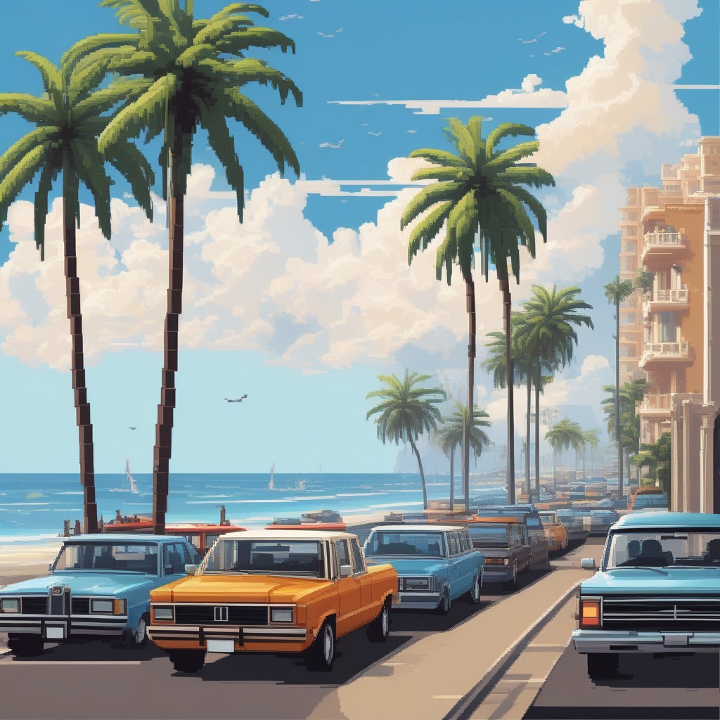 masterpiece, best quality, very aesthetic, absurdres, detailed pixel art, ( no human:1.2), cars from side, Traffic jam of cars seen from the side, beautiful sea, palm tree, daylight, cloud,