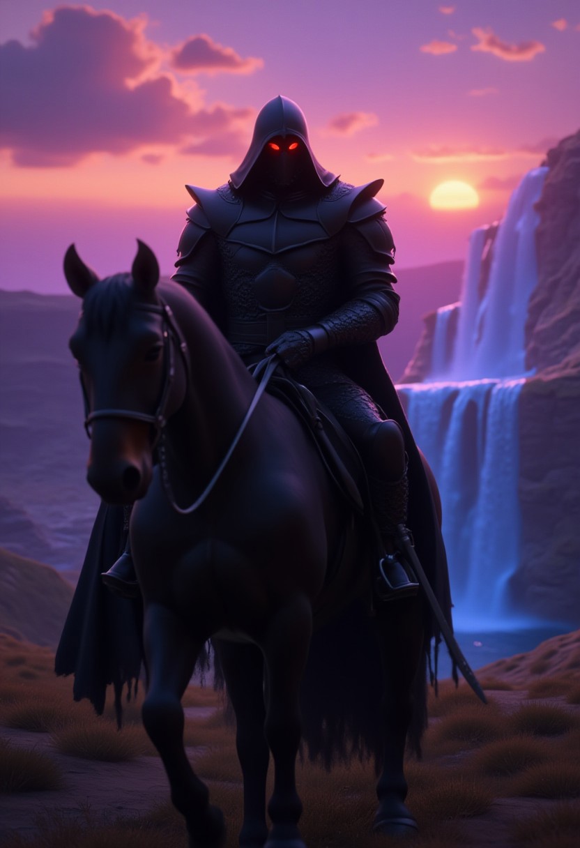 "DisneyStudioLoRa",<lora:Disney-Studios-Flux-000008:0.6>,Black knight, a medieval knight, black cloak with deadly red eyes, riding a shiny black horse, setting sun setting, magical purple and blue waterfalls, low grass field, desert clowns, camera focus on the knight