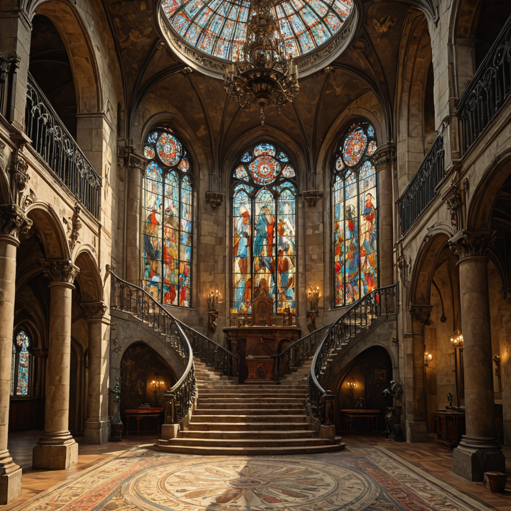 indoors, window, stained glass, colorful:1.2), tower, stairs, architecture, altar, arch, (eye-level on a low-angle high-angle shot of a grand hall:1.2). The castle is decorated with antique furniture. performing a dark ritual on a sacrifice tied to an altar. A disturbing and ominous scene, inside a gothic castle., illustration captures a sense of mystery and intrigue, with a low-angle shot of the castle's grandeur., (in Alphonse Mucha poster style, art nouveau, masterpiece, lithography, muted colors,:1.3) artchlr, <lora:artfullyECHELIER_SDXL_V1:0.75>, black, dark, <lora:- SDXL - vanta-black_contrast_V3.0:0.45>