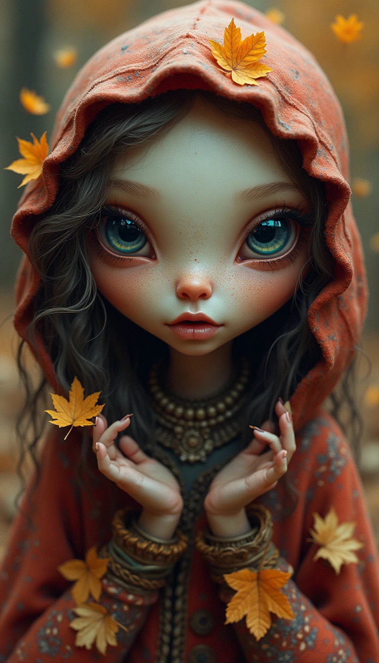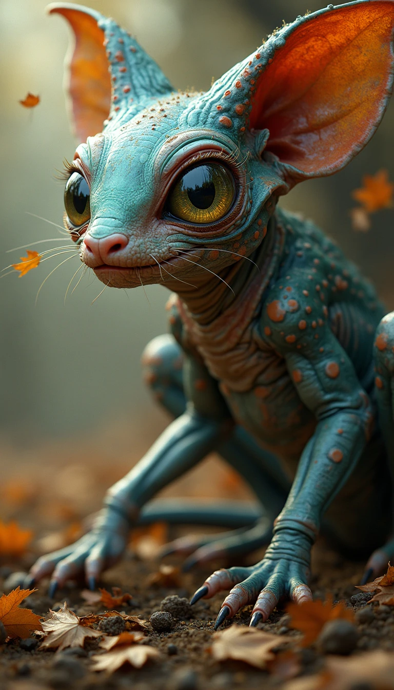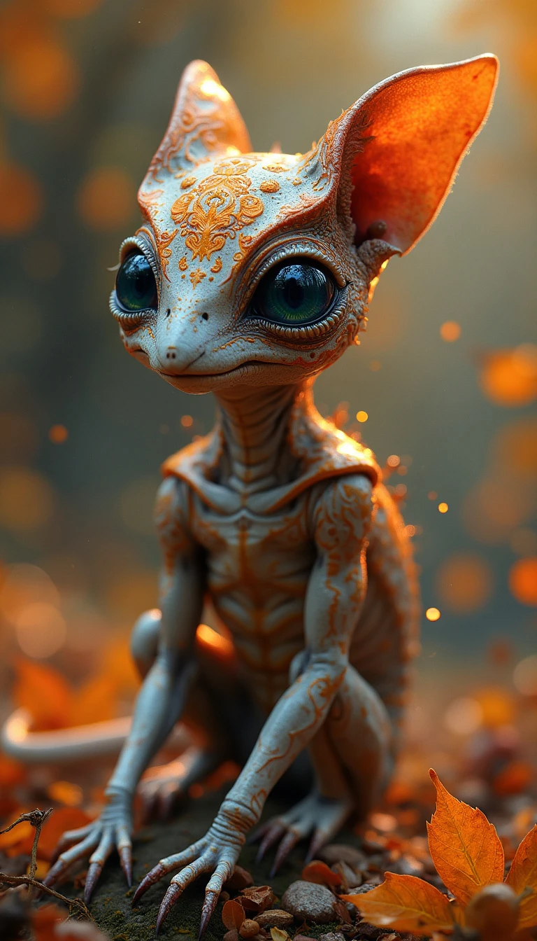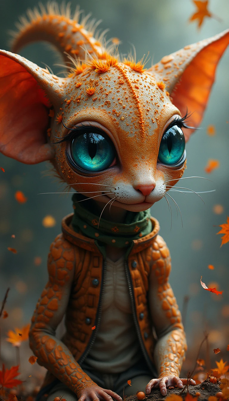 cute autumn alien intricate details, hyper detailed, by Jean Baptiste Monge, Carne Griffiths, Michael Garmash, Seb Mckinnon, hyper realistic, award winning, Jenny Saville, Edward Hopper, surrealism, dark art, volumetric lighting, gorgeous, masterpiece, sharp focus, depth of field, perfect composition, pixiv trends, artstation, 8k, hdr