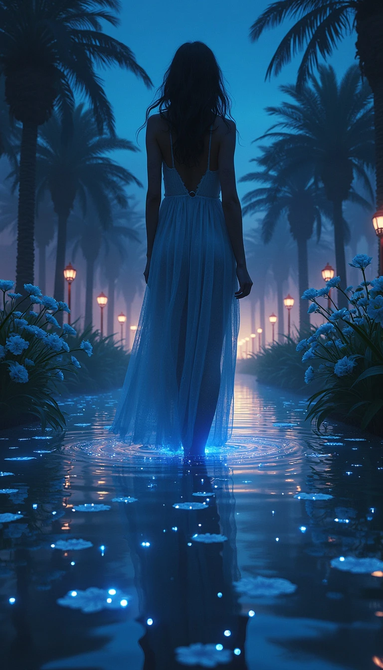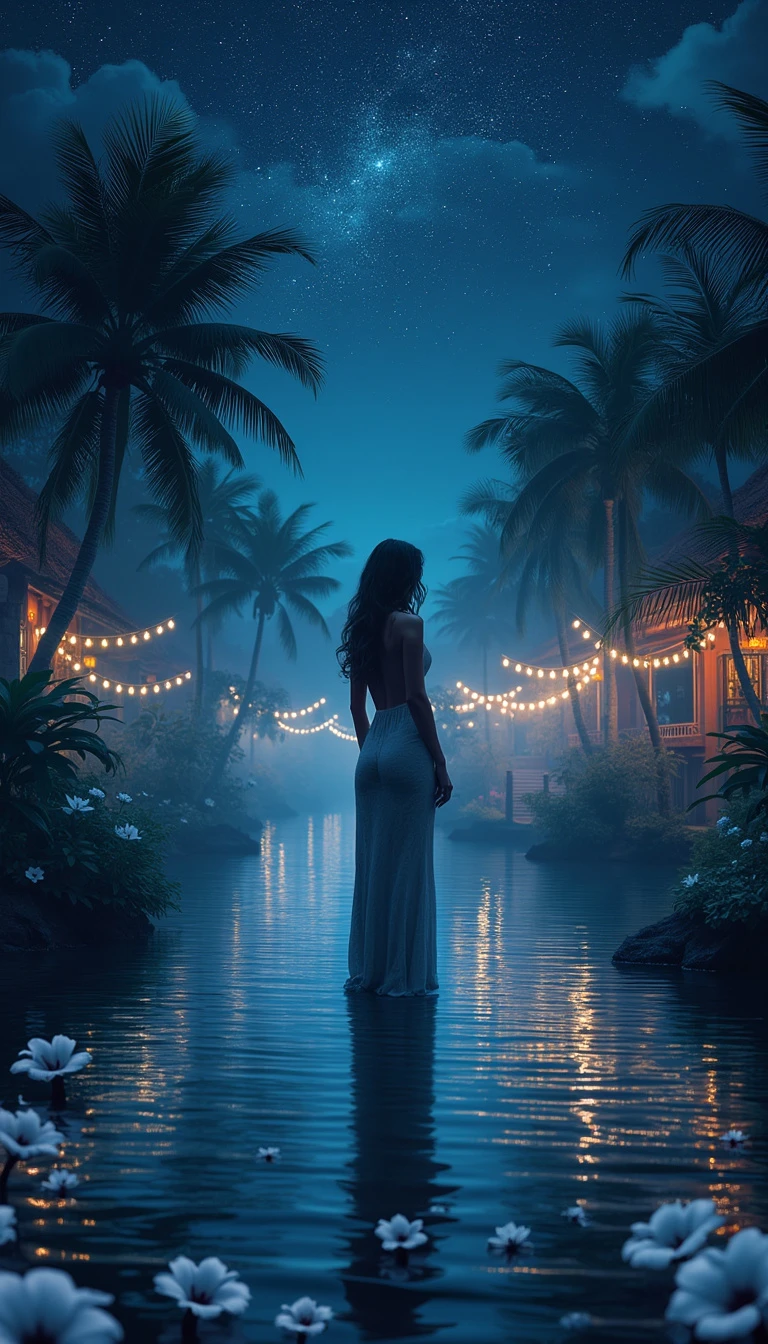 1girl, solo, masterpiece, highest quality, 8K, standing on water, reflective surface, worry free, (poster:0.76), (palm leaves), (rural village), glitter art style, white flowers, (neon black glow:1.2), night, dark theme, starry sky, (bioluminescence), ethereal, truth, 13