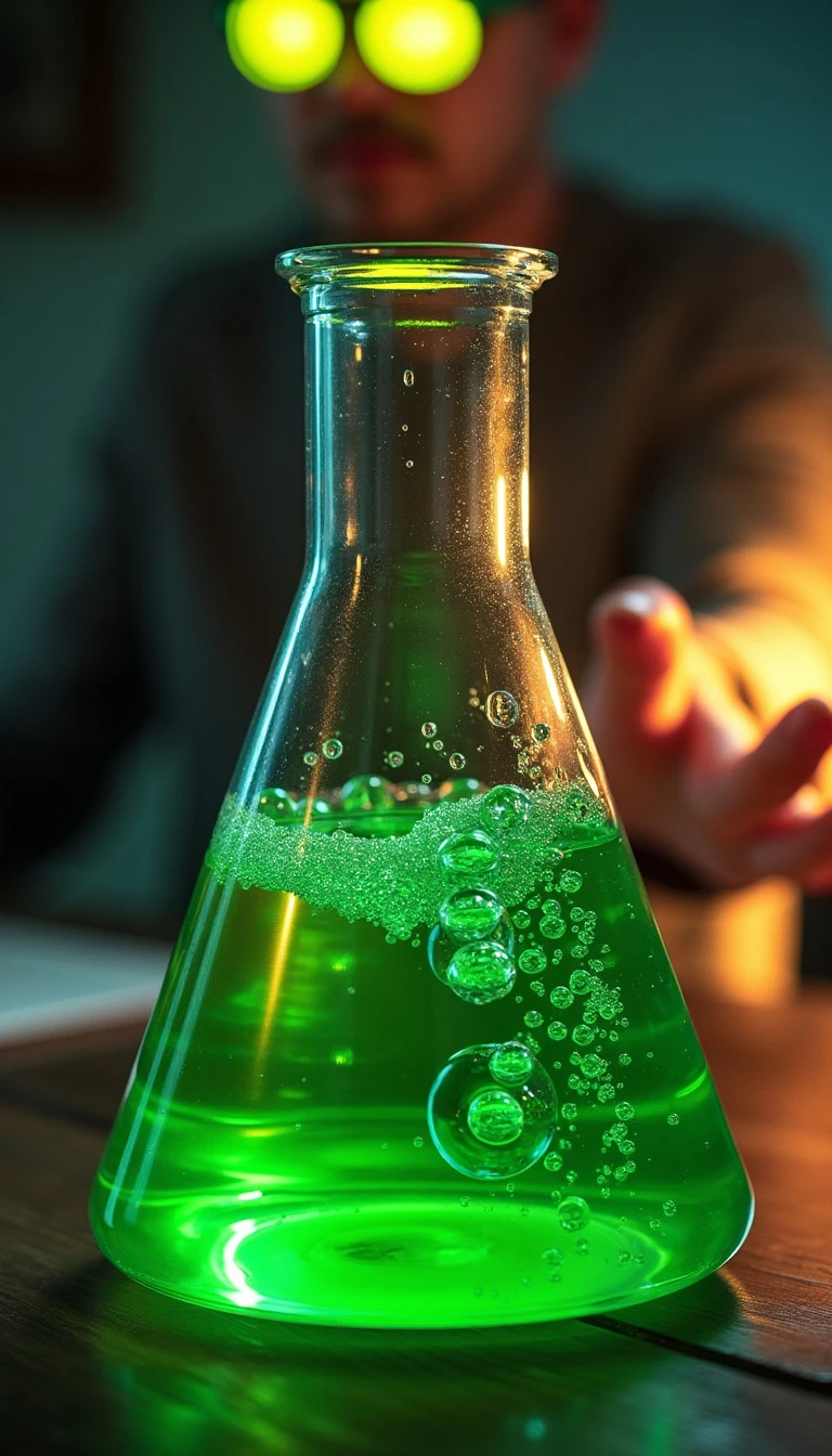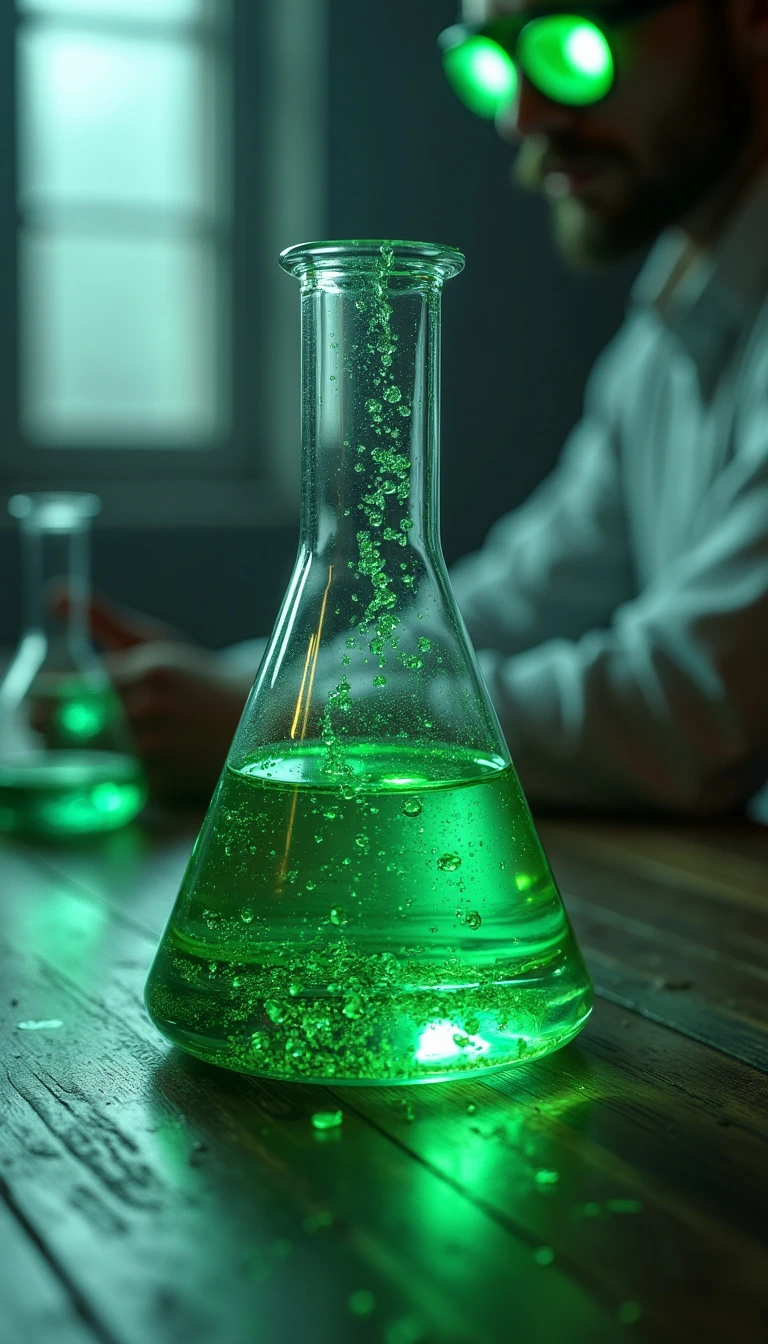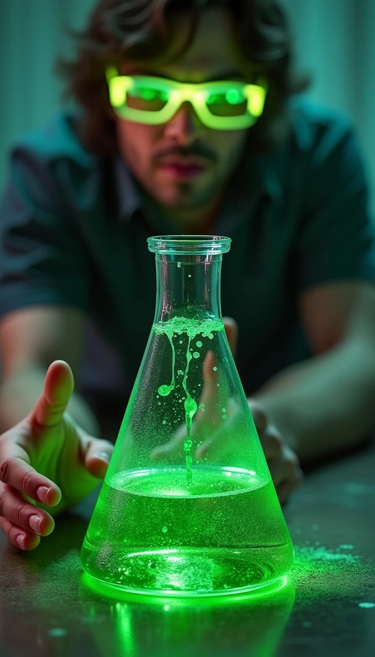 photorealistic image of a a 3d conical flask filled with glowing green liquid, slightly tilted spilling liquid, blurry figure of a man with glowing glasses reaching out their hand in the background photorealistic image, detailed, realistic, 8k uhd, high quality