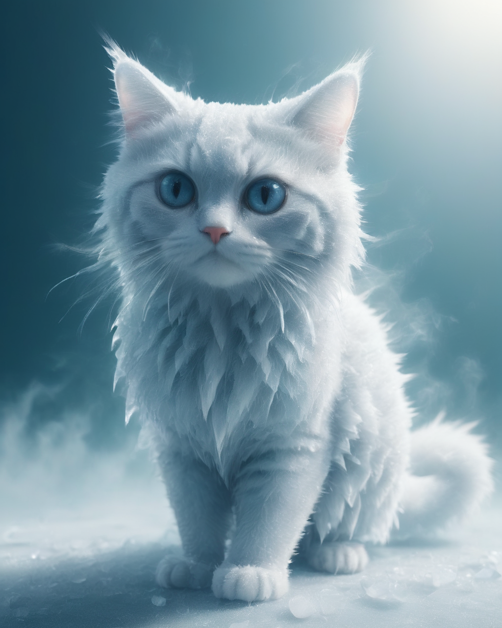 <lora:xl0918ice:0.9>, (ice spikes:1.2),(realistic light blue white cat:1.1),(swirling ice fur:1.4),(ice smoke:1.2), (fat:1.2), (fluffy:1.4),(very big eyes:1.5),(very big eye pupils:2.5), side view, light blue lightning fur stripes, shinny light blue crystal eyes, spectacular epic environment, high quality ice and snow, high resolution, wallpaper, Ice spikes, Ice crater background, hdr, masterpiece, photorealism, photorealistic, 8k, soft focus, volumetric light, dramatic atmosphere, <lora:made_of_ice:1> <lora:Ice:1>