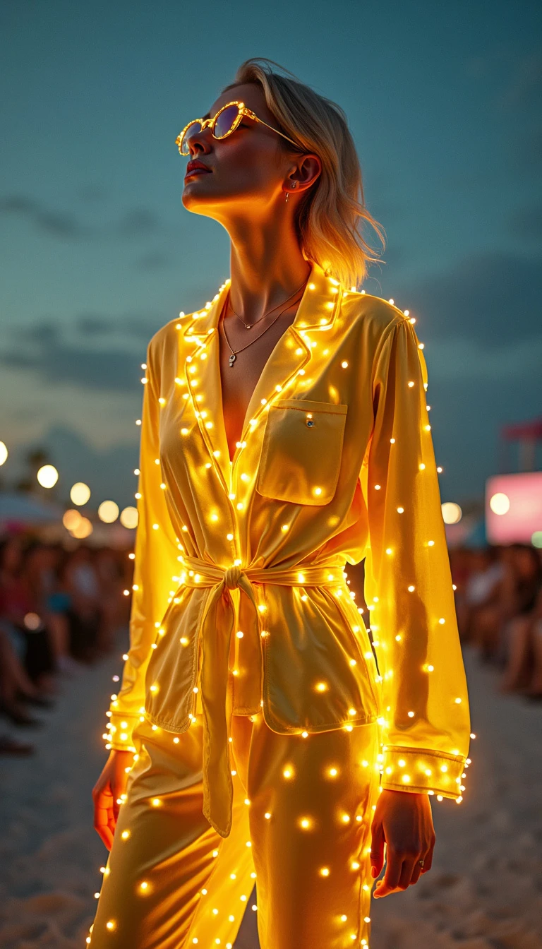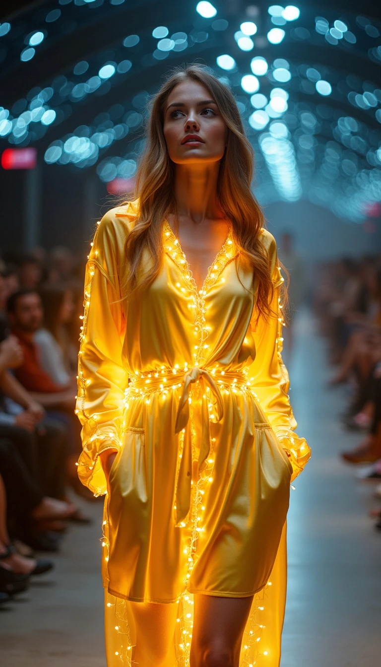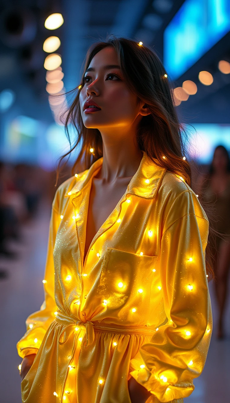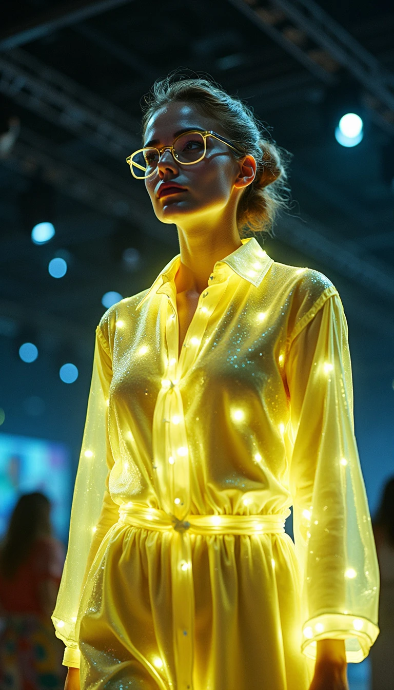In a surreal scene, a shimmering and sophisticated model sleep shirted in a bright yellow fashion outfit and tie stands proudly on the runway. The sleep shirt is made of shimmering neon lights that dance around her face as she gazes out at the sky.