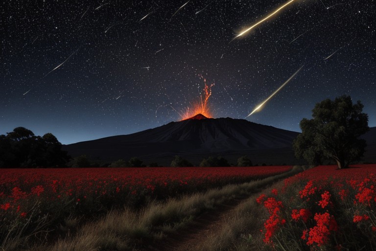 ((overlooking an exotic alien landscape)), ((blue sand)), ((sand is colored blue)), ((hills of blue sands)), green shrubs growing in the sand, shrubs are stubby and sporadic, ((sky is overcast with clouds)), shrubs have bright red flowers, ((area is covered in black volcanic ash)), ((blue volcanic ash covering the land)), ((tall burnt trees)), dusty fog, ((night time)), ((tiny fireflies flying around)), ((meteor shower occurring)), ((streaks of meteors))