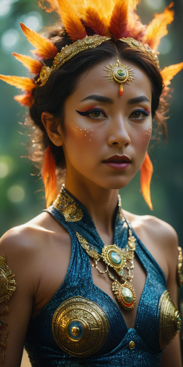 Front view of a Fu Fun God character, androgyne gender, Humans, Cosmic Nebula skin, soft skin, Bright sun rays through morning fog, Fire dancers in action., beautiful deep eyes, powerful, shot by by Cindy Sherman, intricate, saturated colors, sharp focus, surreal lighting, film grain, detailed eyes, 8k textures , intricate, highly detailed, sharp focus, insane details, intricate details, hyper detailed, exposure blending, hdr, hyperrealistic, 8k, Dazzling, 85mm - 135mm, f1.4, Mamiya Press Super 23