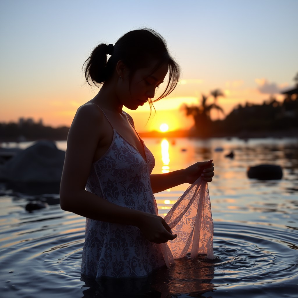 One Pinay lady washing her clothes in the river early morning during sunrise. The clothes is sexy lace dress from last night.