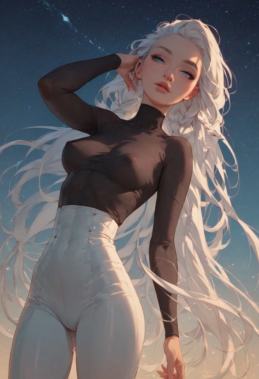 score_9, score_8_up, score_7_up, score_6_up, (a girl, 20 years old, blue eyes, long hair , white hair with braided ponytail , perfect face, perfect eyes, tall, slim, medium breasts, hard nipples, sexy girl, beautiful eyes, posing, dynamic angle, standing, tight-fitting White suit, tight-fitting black Shirt, Night City Sky Scene, wide angle,