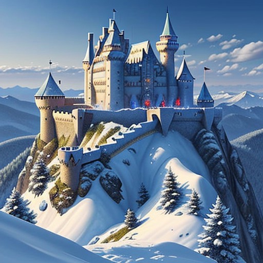 mountain castles, in ice and snow, fortified but comforting, on top of a mighty mountain in large mountain range, great bridges connect the castle to other towers on other mountains forming a great castle network