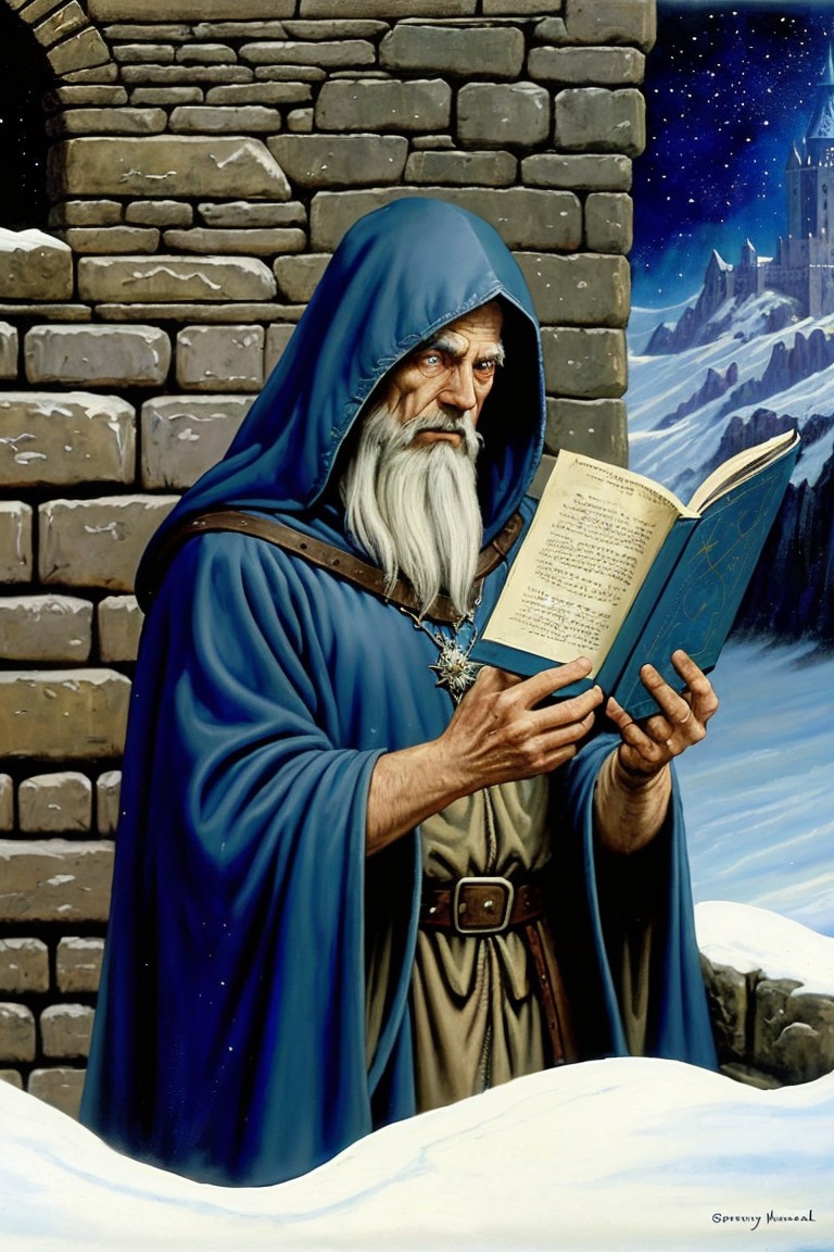 ((oil painting)), masterpiece, best quality, dungeons and dragon, DND, 80's, 80's vibe, an old wizard, a blue coat and hood on head, stars on coat, white hair and small beard, ((upper body)), stone wall in background, medieval theme, dnd, retro fantasy, fantasy art, by (Clyde caldwell:1.2), larry elmore, frank frazetta
