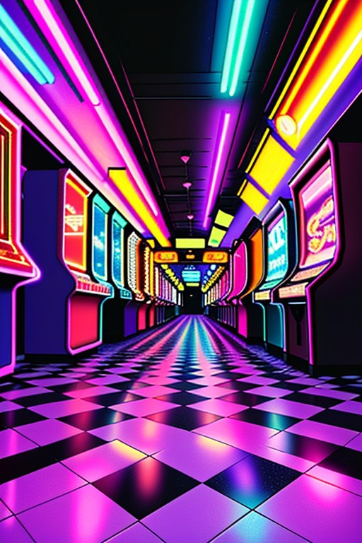 Photorealistic, Canon EOS Mark IV, synthwave punk style, vaporwave style, synthwave, vaporwave colors, nvinkpunk, Wave Art Style, dark room, checkered floor, indoors, neon lights, no humans, neon arcade 1980s vaporwave scene, indoors, expressive, vibrant, neon, retro photography, 1980s, checker tile floor, high detailed, 8k, outrun, electric light wires, ultra sharp, extremely detailed, masterpiece, official art
