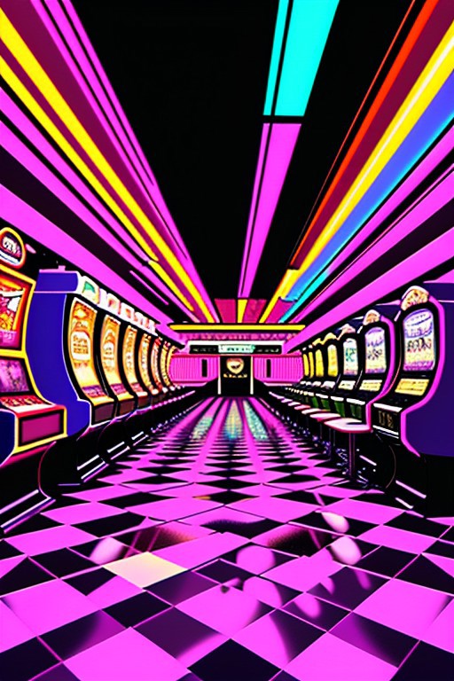 Photorealistic, Canon EOS Mark IV, synthwave punk style, vaporwave style, synthwave, vaporwave colors, nvinkpunk, Wave Art Style, checkered floor, indoors, neon lights, no humans, neon arcade 1980s vaporwave scene, indoors, loud speaker on the ceiling, casino vibes, expressive, vibrant, neon, retro photography, 1980s, checker tile floor, high detailed, 8k, outrun, electric light wires, ultra sharp, extremely detailed, masterpiece, official art