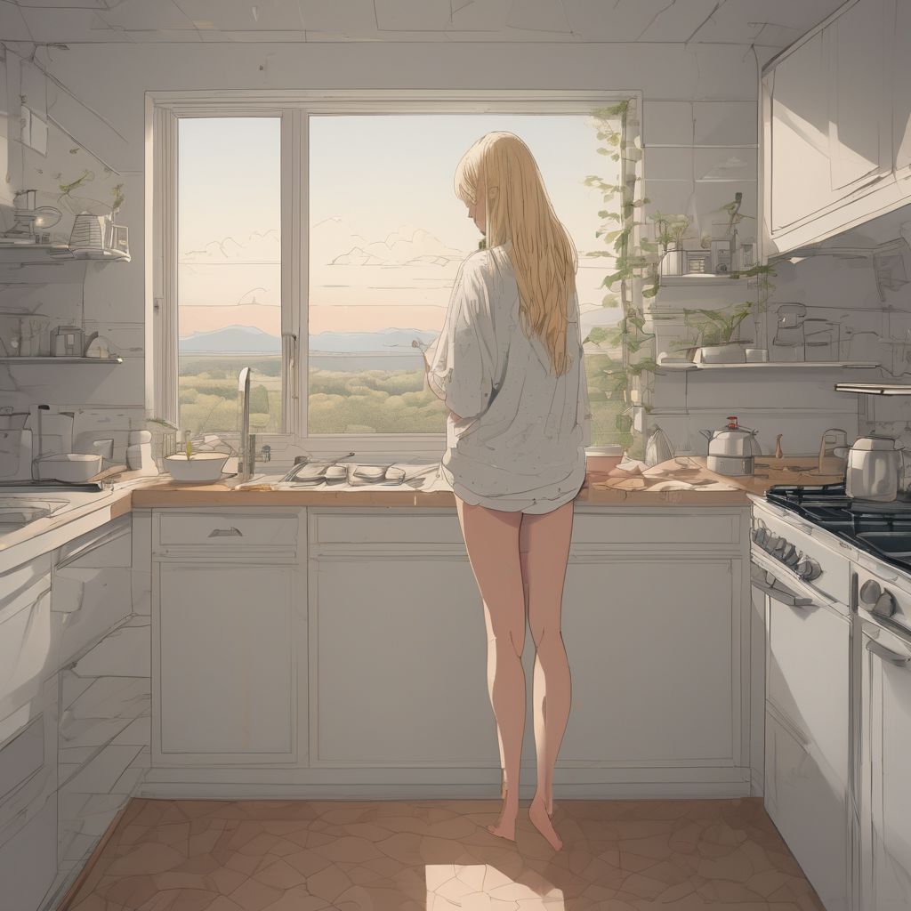 score_9, score_8_up, score_7_up, rating_explicit, 1girl, full shot, from side, 18 years old, sleepy woman bending over, wearing fuzzy slippers and a t-shirt, in kitchen, long messy blonde hair, pale skin, blush, freckles, large sagging breasts, perfect ass, thighs, (awe, heart),indoors, kitchen, sunrise, spring morning,