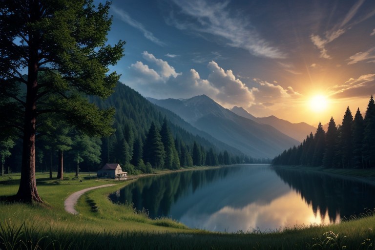 SUN,BRIGHT SUN,CLOUD,BLUE SKY,HIGH MOUNTAIN,LAKE,SCENERY, MASTERPIECE,FULL HD,UHD,8K,HIGH QUALITY,SUNSET, AFTERNOON,FOREST,RPG,RPG WORLD,HOUSE,