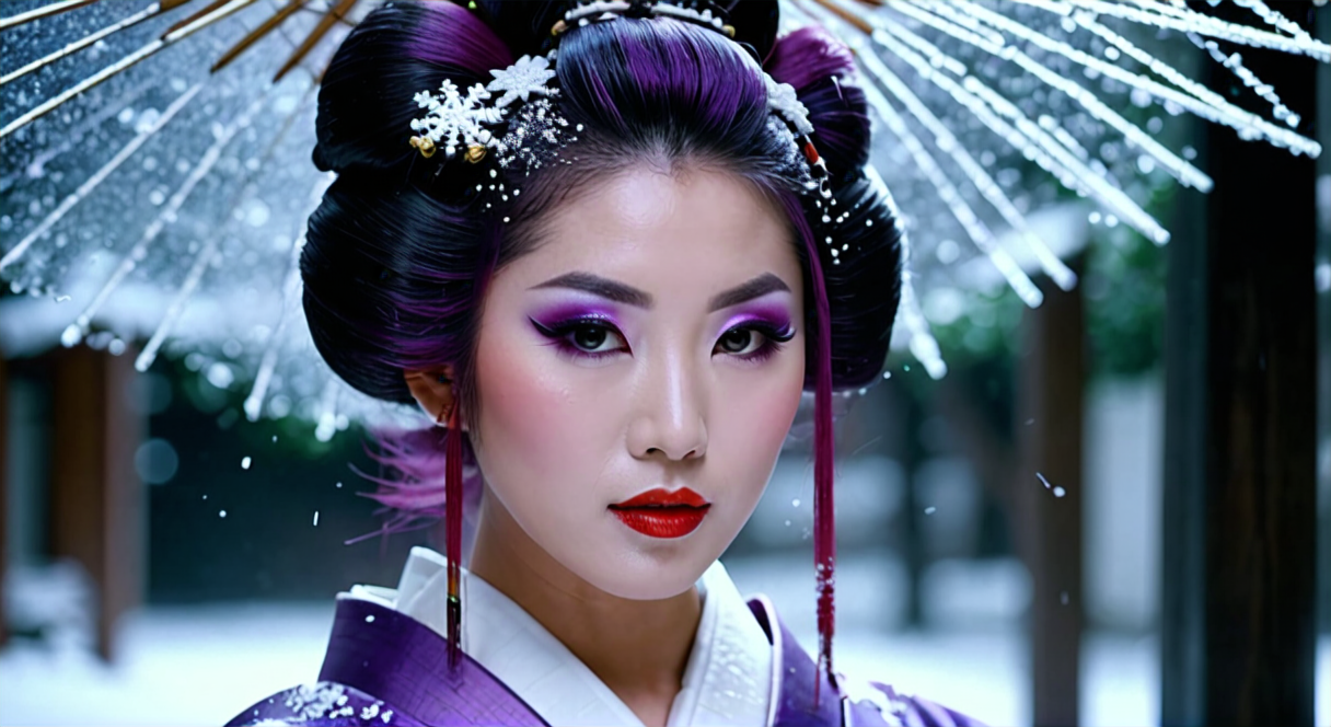 RAW photo, Close-up view, a beautiful geisha, lip gloss, purple hair, japanese haircut, High-Fashion Samurai, standing in a Samurai District in Kanazawa, ice crystals in the air, snowing, snownflakes, (night), intricate details, 8k uhd, soft lighting, high quality, natural lighting, film grain, shot with Bronica GS-1 6x24, <lora:JuggerCineXL2:0.5> Movie Still, Film Still, Cinematic, Cinematic Shot, Cinematic Lighting, film grain,