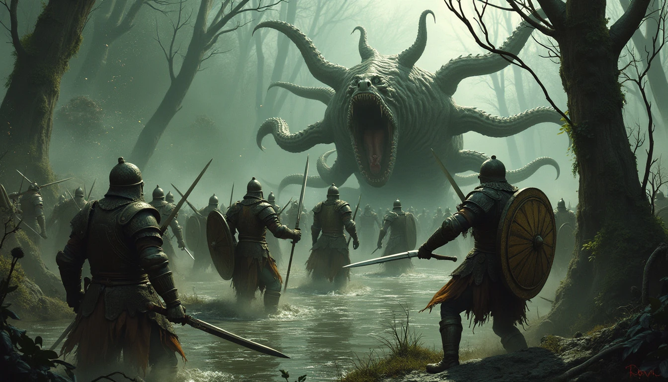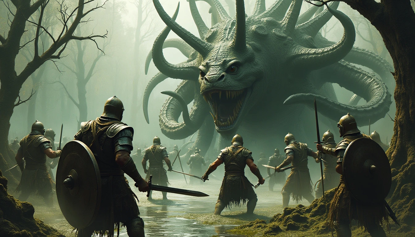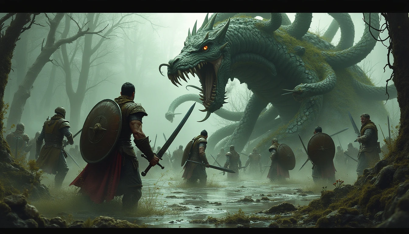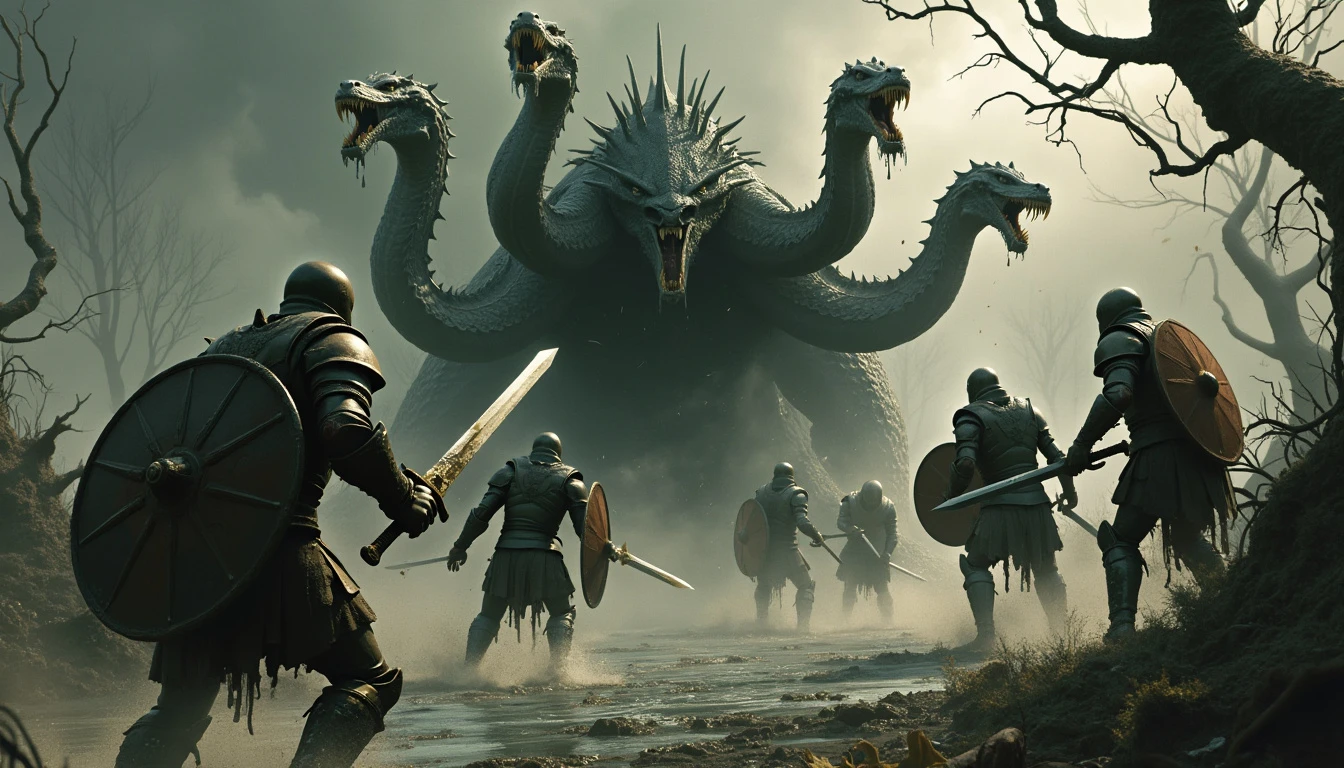 The scene captures the chaos of battle as warriors, armed with swords and shields, confront a multi-headed hydra emerging from the murky waters of a swamp. The hydra’s heads snap and hiss, its serpentine bodies coiling around the warriors, who struggle to fend off the relentless attacks. The swamp is dark and foreboding, with twisted trees and thick fog adding to the sense of dread. The warriors’ armor is splattered with mud and water, and the air is filled with the sounds of clashing steel and roaring beasts. Extremely detailed, hyperrealistic, masterpiece, best quality.