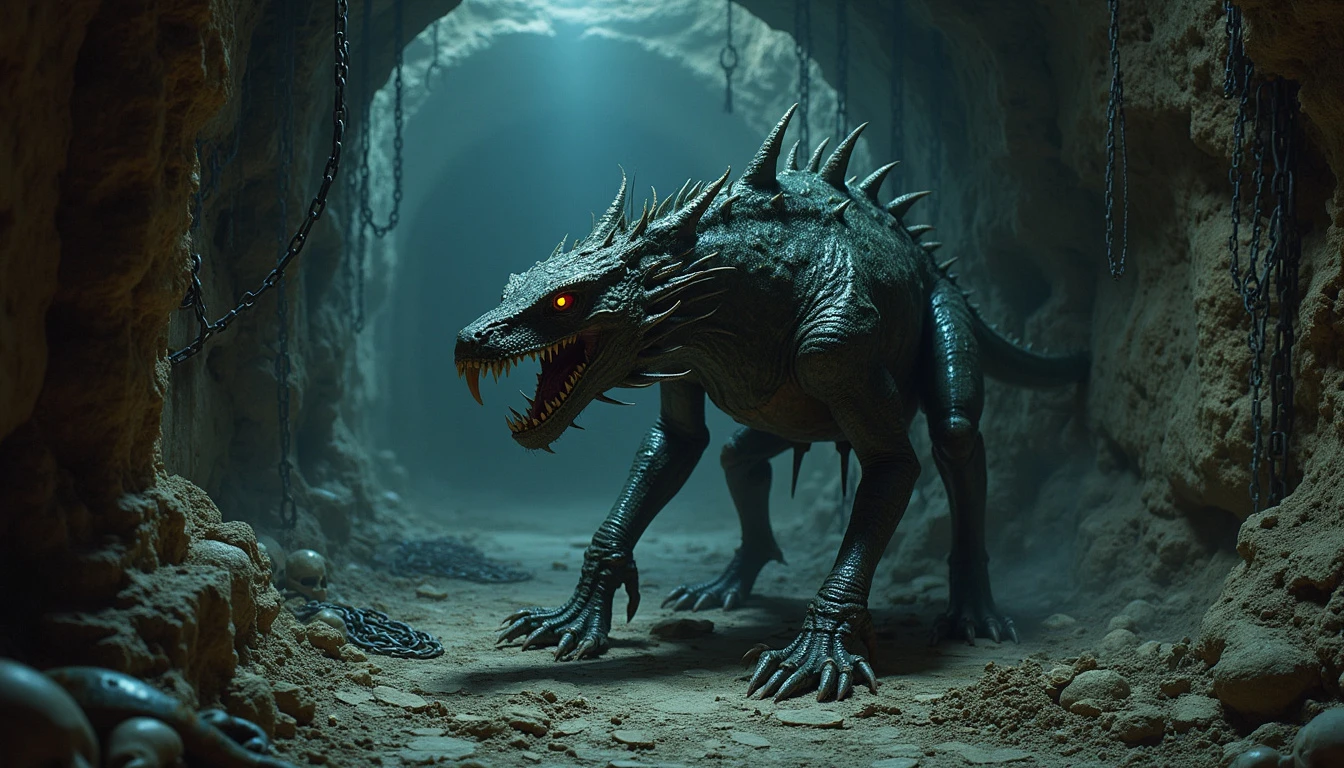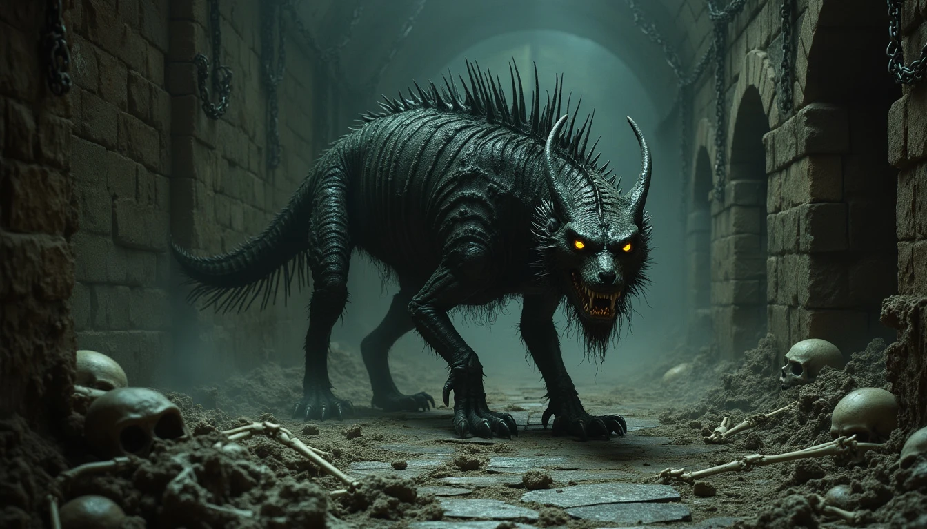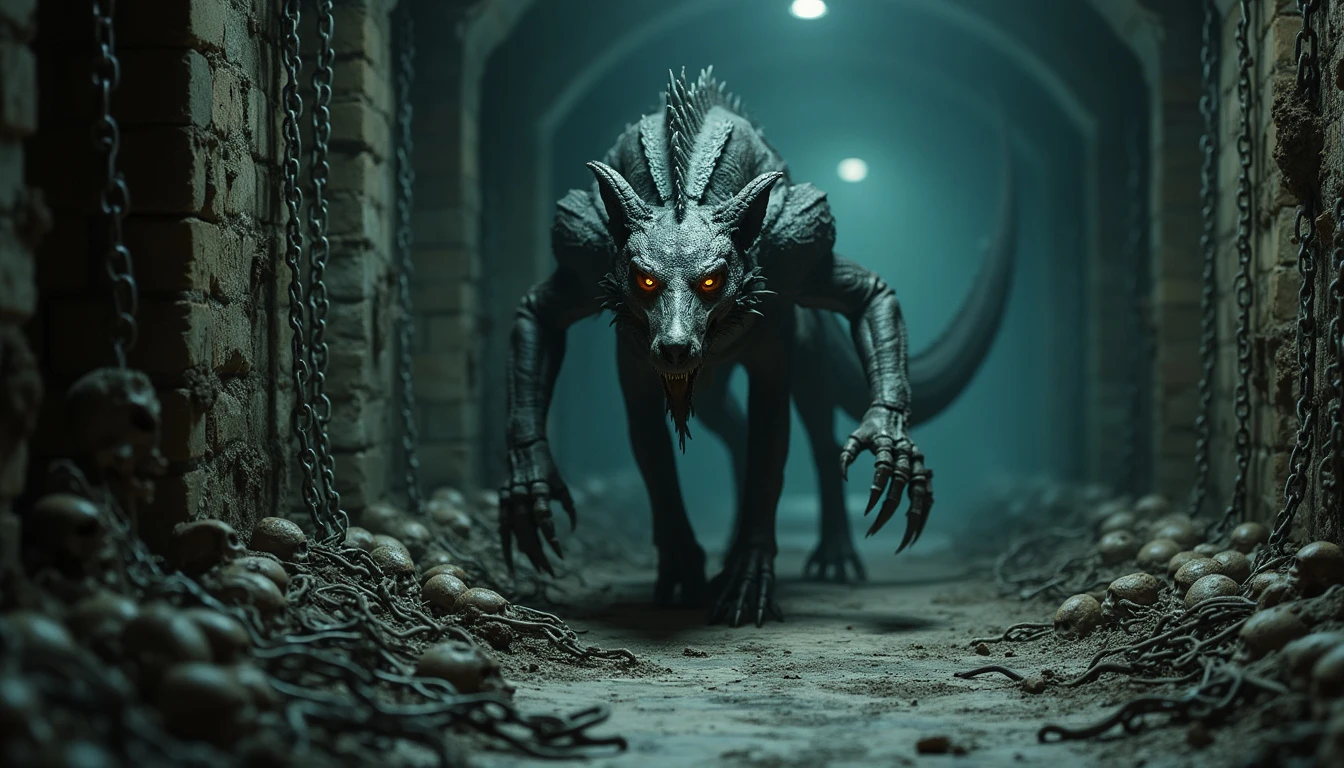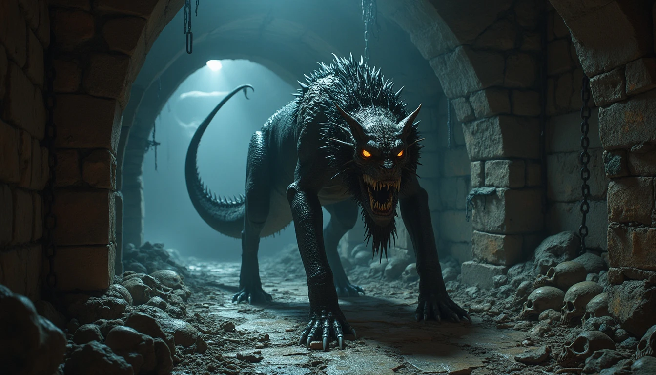 The chimera, with the body of a lizard, the head of a wolf, and the tail of a scorpion, prowls the dark, damp corridors of a dungeon. The walls are lined with iron chains and decaying skeletons, and the air is thick with the smell of mold and decay. The creature’s eyes glow in the darkness as it searches for any intruders. The atmosphere is eerie and oppressive, with the sense of danger around every corner. Extremely detailed, hyperrealistic, masterpiece, best quality.