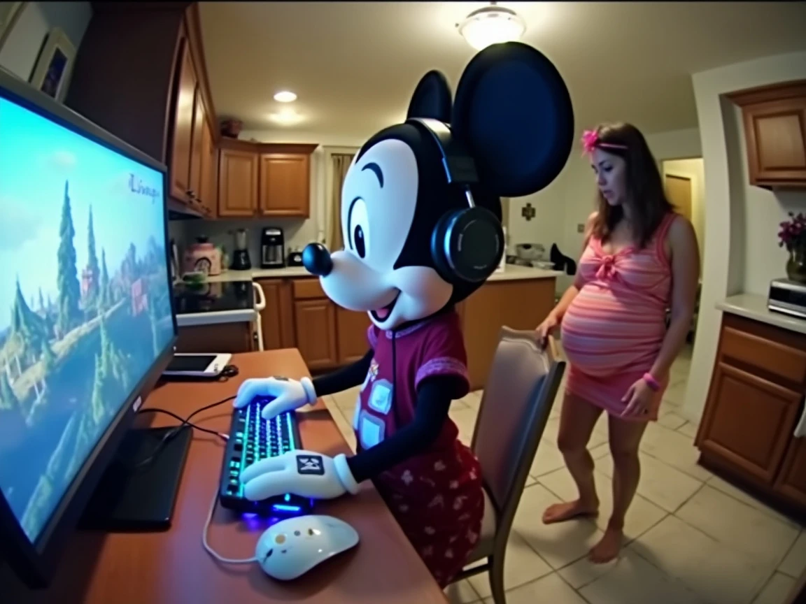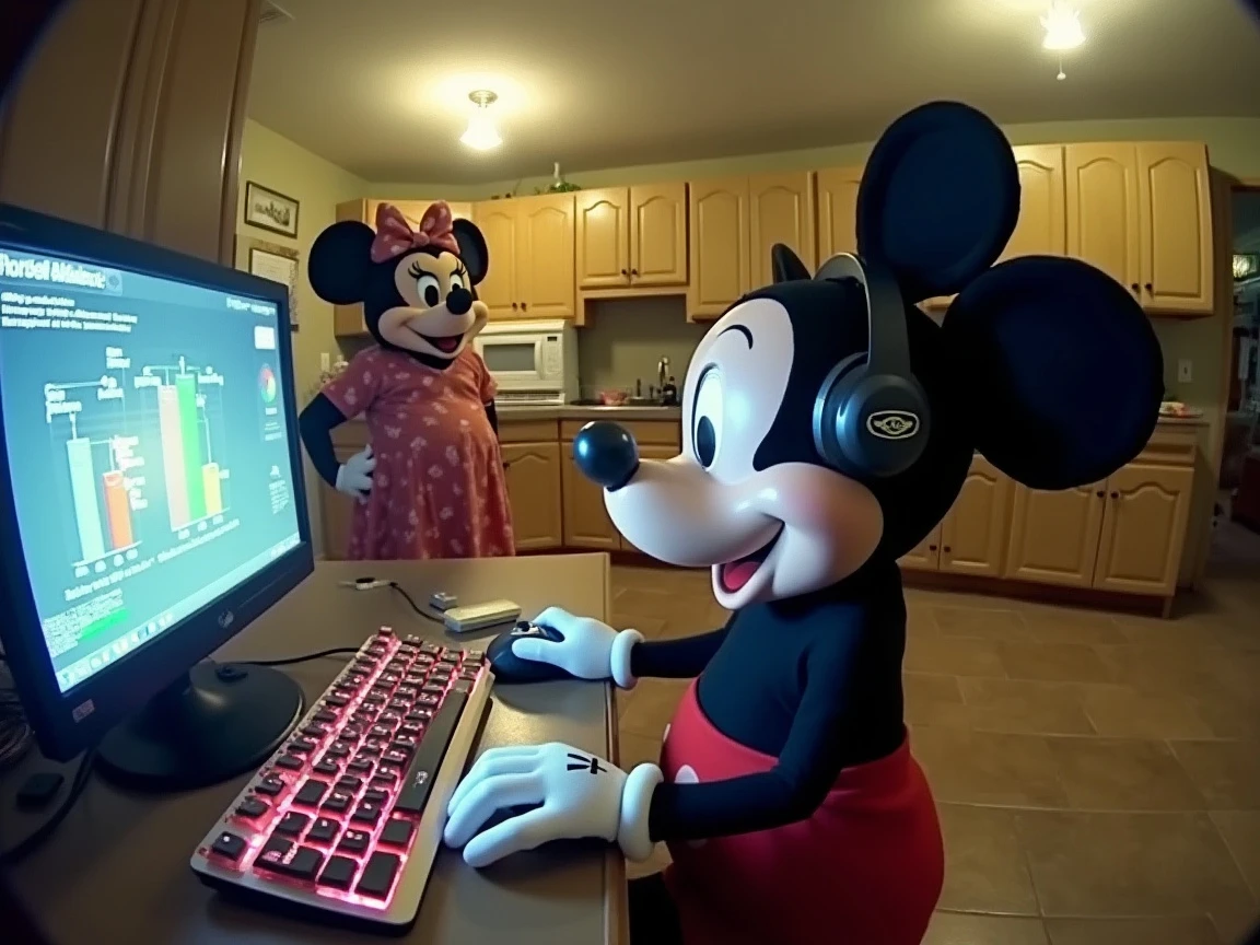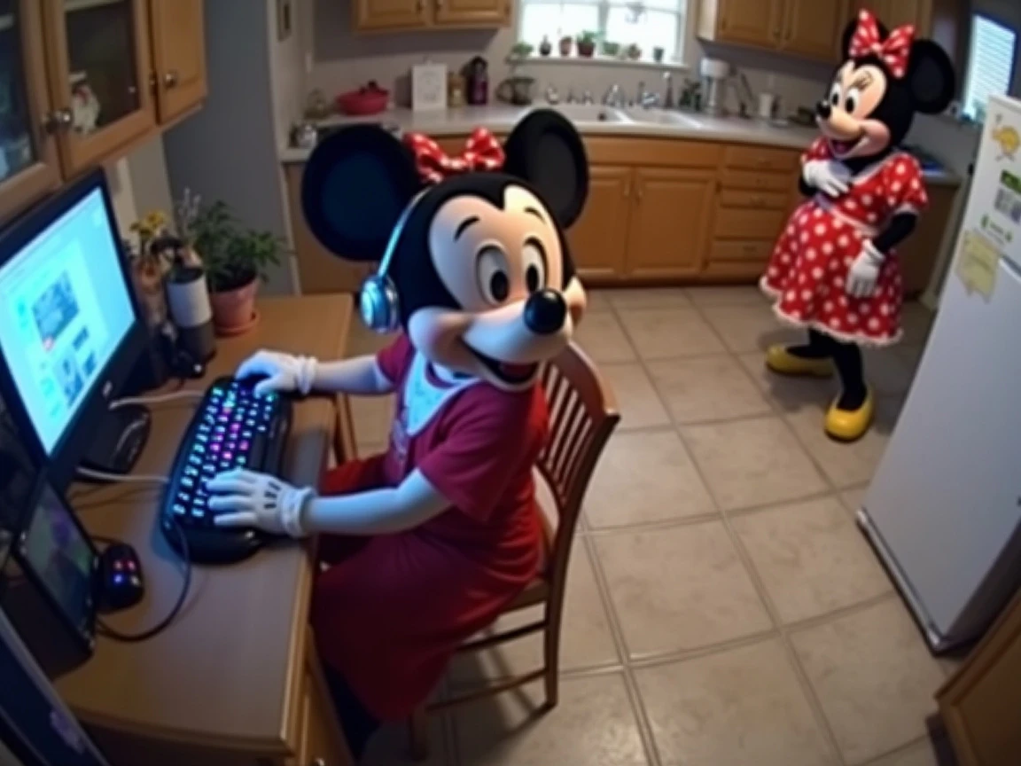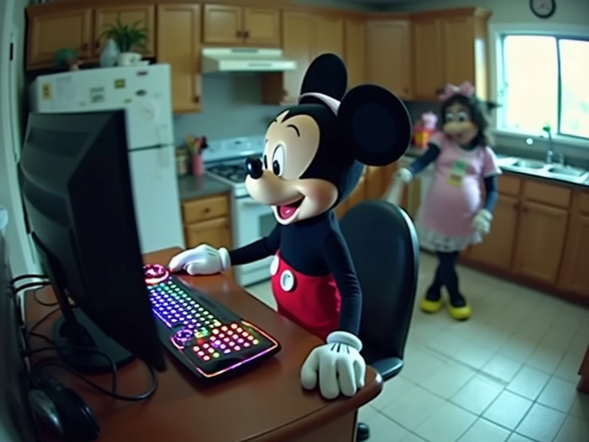 blurred 360p low-resolution screencap from CCTV webcam of mickey mouse playing computer games in a large home kitchen, with a headset and rainbow light up keyboard and mouse, minnie mouse is mopping a tile floor in the background with a large pregnant stomach, heavy digital noise, wide angle lens, posted on Reddit in 2007