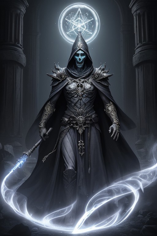 A stunning, highly detailed dark fantasy full body illustration of a proud lich, skull face, wearing armor, shoulder armor, pauldrons, black cloak, candlelight, cape, chain, crown, gloves, glowing, glowing eyes, holding weapon, sword, looking at viewer, magic, own hand together, red glooming eyes, epic composition. The lich stands heroic with a flowing cloak and hood, thunderclouds in the background with insanely intricate details and textures, gloomy dramatic lighting, benevolent expression, magical aura, gaunt figure, glowing pulsating light, wizard robes, ancient attire, arcane symbols on robes, contemplative posture, staff in one hand, open book in the other, healing magic emanating from book, mystical environment, arcane artifacts, runes, council chamber setting, ethereal wisps, magical energy lines, vibrant colors for magic, earthy and metallic tones for attire, ageless appearance, timeless, well-preserved robes, intricate jewelry, enchanted items, magical light, ancient and mystical atmosphere, arcane council chamber, filled with magical artifacts, ancient runes on walls, glowing symbols, ethereal wisps of magic, shelves of ancient books, mystical light sources, floating candles, enchanted items on display, mystical environment, old stone architecture, intricate carvings, arcane symbols, pulsating energy veins, glowing crystals, magical portals, otherworldly ambiance, BadDream, lich