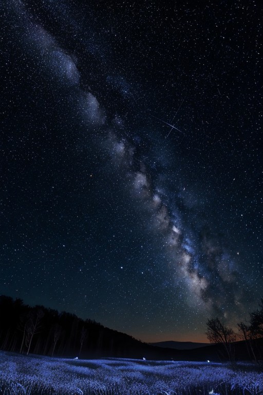 (masterpiece, best quality), starry night sky, bright full moon casting a gentle glow over the landscape, twinkling stars scattered across the sky, Milky Way visible as a faint band of light, subtle clouds drifting by, deep indigo and midnight blue hues, soft gradient from the horizon to the zenith, shooting star streaking across the sky, serene and peaceful atmosphere, photorealistic, high detail, long exposure effect, glowing stars, clear night, atmospheric perspective