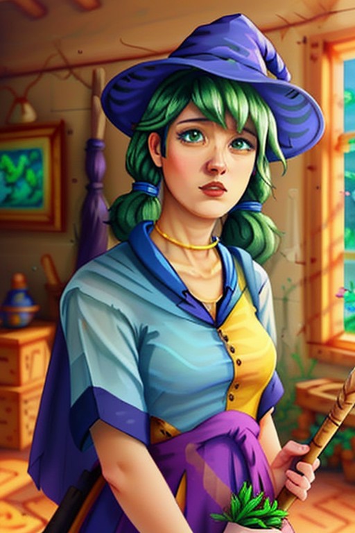 master piece,(anime colored),caroline,Stardew Valley,(one woman:1.1),{forestgreen hair},witch's hat, witch's clothing, holding a broomstick,beautiful face,no pupils,short hair,{short twintails},from front,indoor,masterpiece,extremely fine and beautiful,solo,witch, <lora:caroline:1>