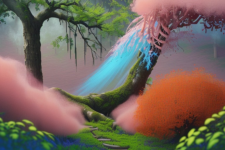 ((overlooking an exotic alien)), green forest, sharp trees, ((orange stems protruding above the trees)), ((fuzzy yellow flowering stems above trees)), ((pink vines hanging)), ((pink vines twisted around)), ((blue moss)), (((blue moss on tree bark))), ((powder blowing off flowers)), (red flowers giving off dust), (red dust blowing off red flowers)