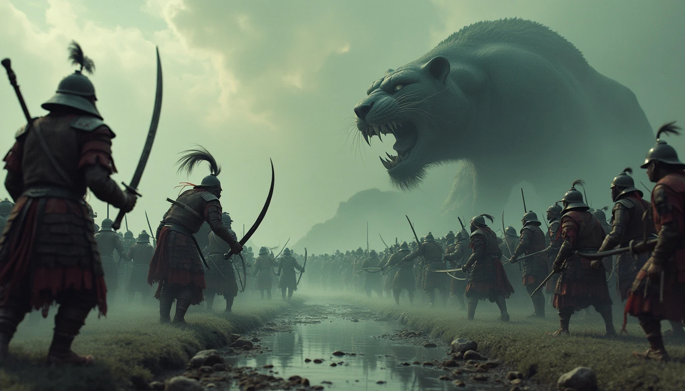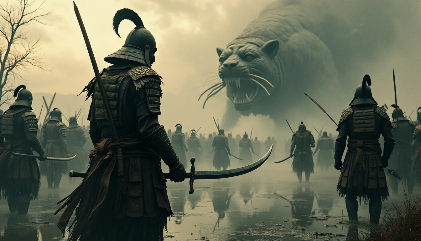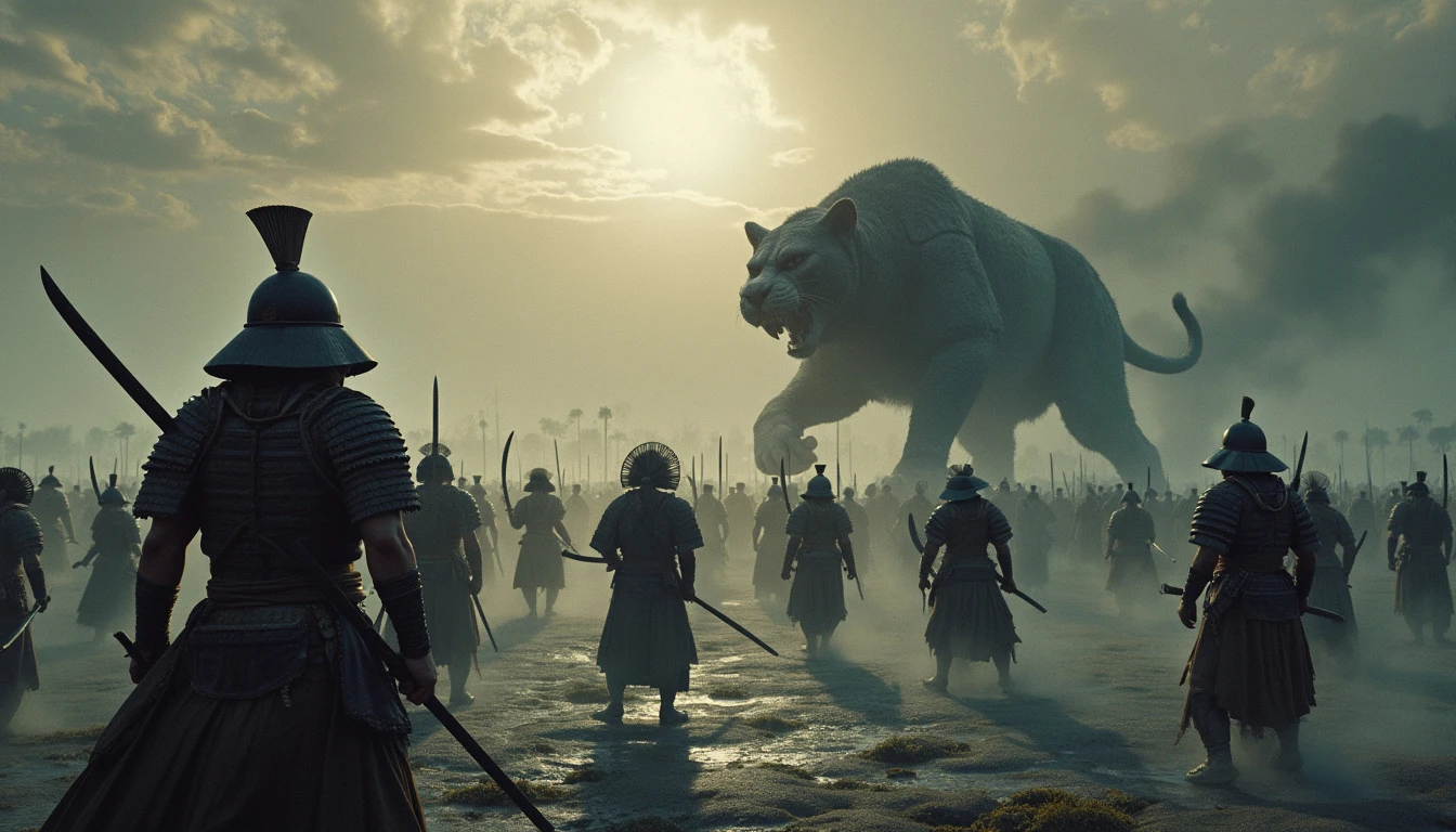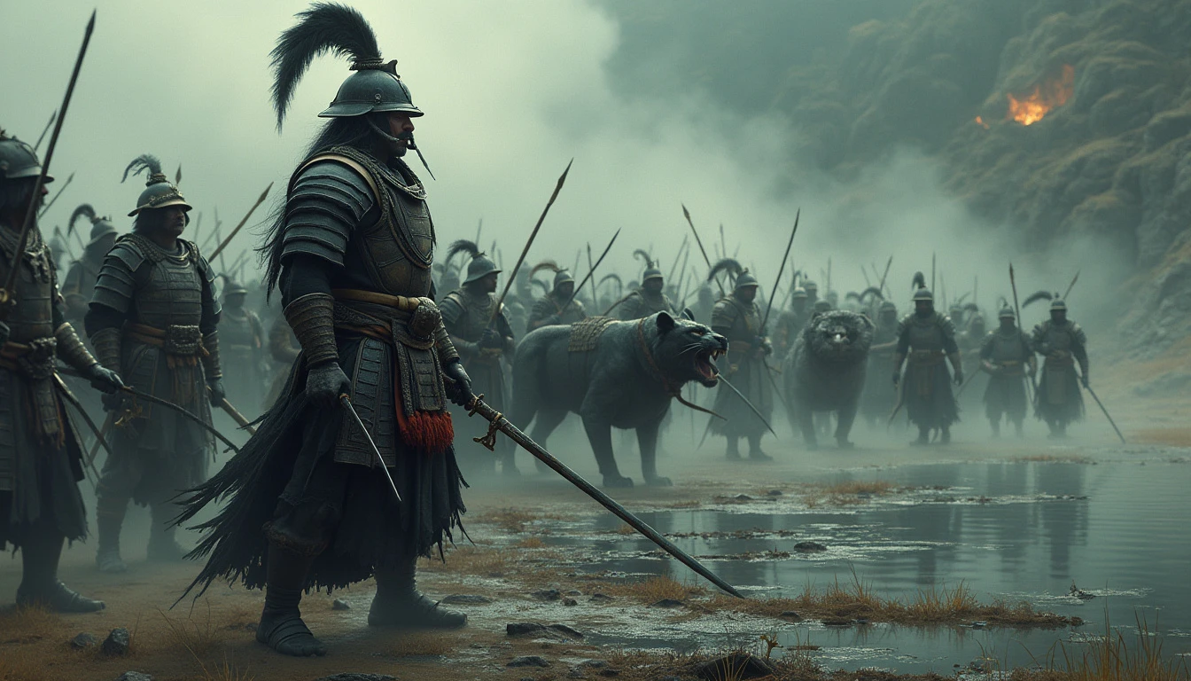 Across the battlefield, the Aztec warriors prepare their obsidian weapons, their panther-chimera stalking forward with silent menace. The tension is thick, with the mist rising from the lake creating an eerie, otherworldly atmosphere. The scene captures the poised strength of the Samurai as they stand resolute against the foreign invaders. Extremely detailed, hyperrealistic, masterpiece, best quality.