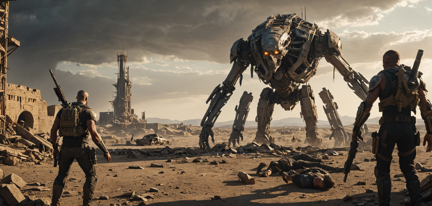 cinematic scene, realistic image, science fiction, A desperate last stand in a post-apocalyptic wasteland. A small group of survivors, armed with makeshift weapons, defend their fortified compound against a horde of mutated creatures. The sun beats down on the cracked earth as the survivors fight for their lives. Explosions rock the walls as the creatures attempt to breach the defenses. In the distance, a towering, skeletal structure looms over the horizon, a constant reminder of the fallen civilization