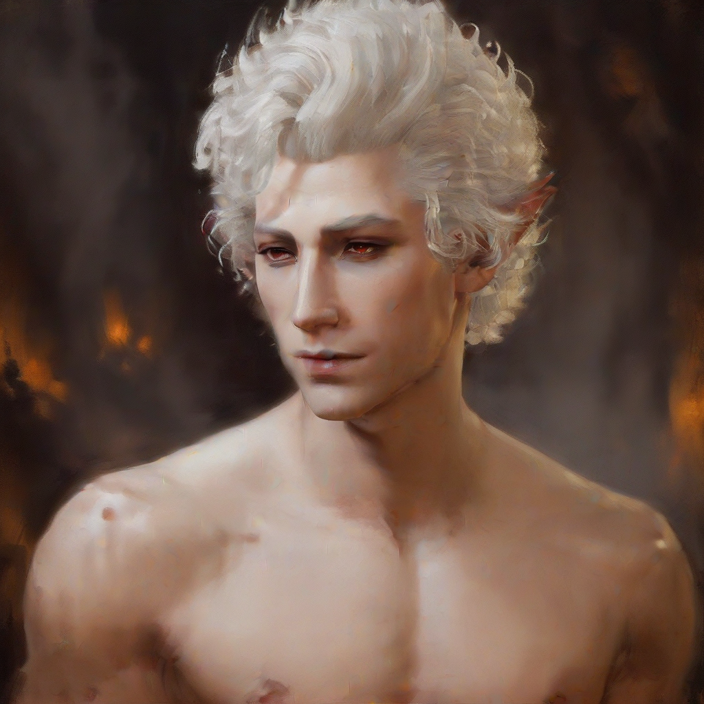 sexy nude young muscular man, curly white hair, vampire, elf, handsome man, astationxl, <lora:astationxl:0.95>, oil painting , (painting:1.5), Rembrandt style