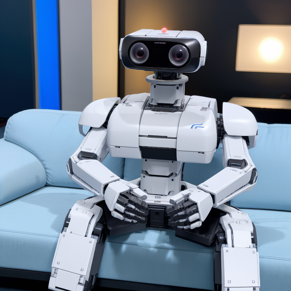 <lora:ROBXL:0.5> black robot robxl wearing white jacket with high collar,Playstation 5, on light blue couch, (anime, masterpiece, intricate:1.3), (best quality, hires textures, high detail:1.2), (4k),(incredibly detailed:1.4),UHD, 8K, ultra detailed