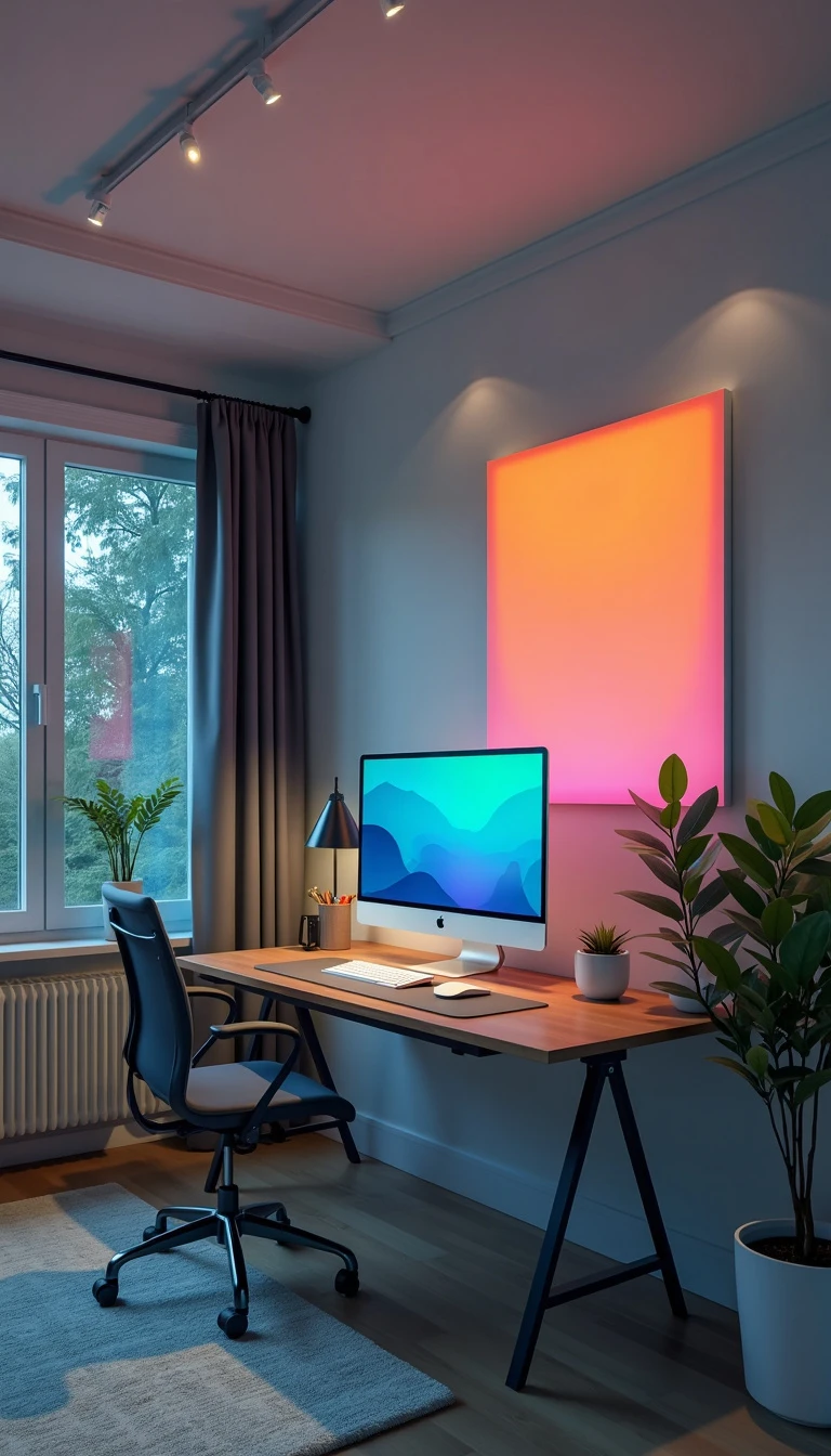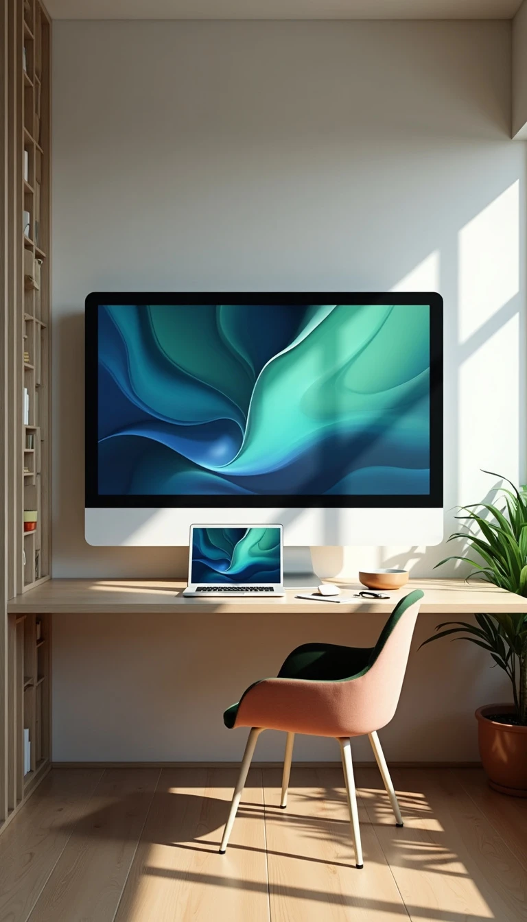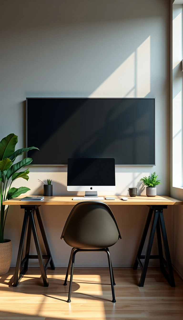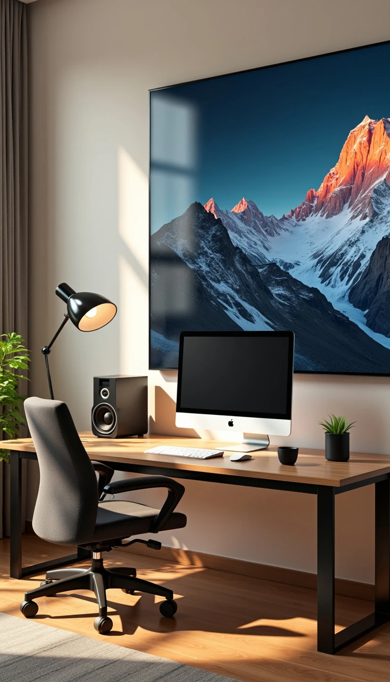 A room with a table and a computer on it and a big screen on wall