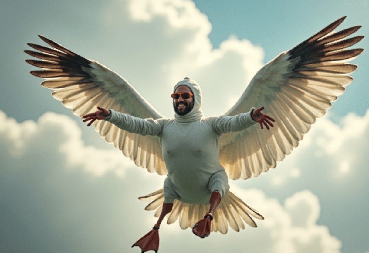 The image contains a dramatic photo of a renowned superhero known as "the goose". He flys through the clouds with his giant flock geese. He flies in close formation with his flock. He wears a white costume reminiscent of goose feathers. He is smiling as he enjoys flying with his goose Brothers.